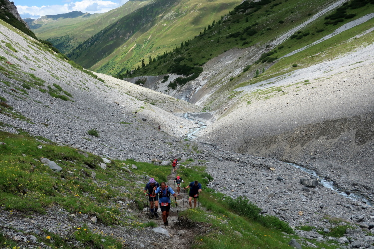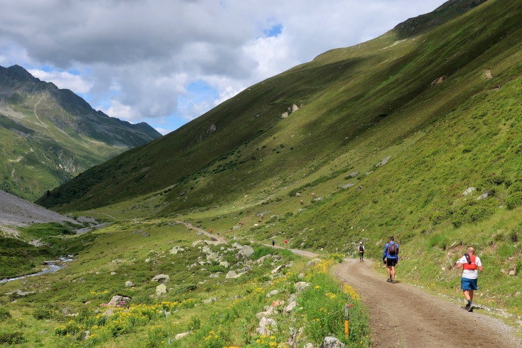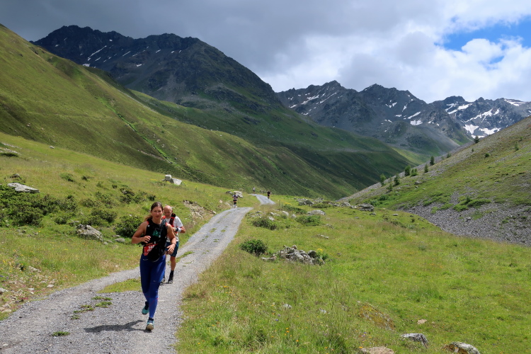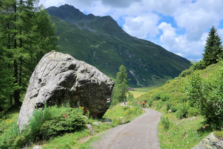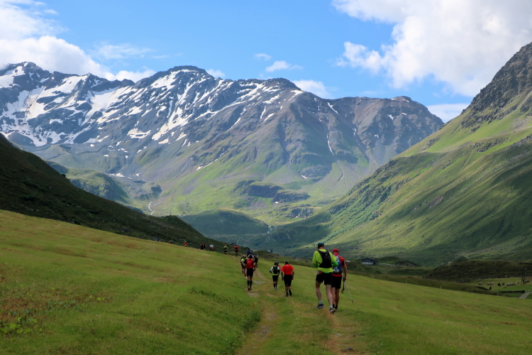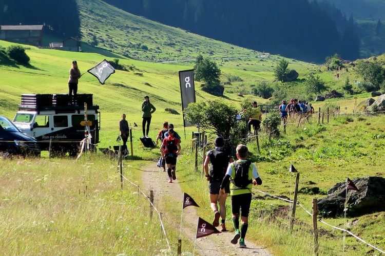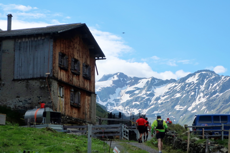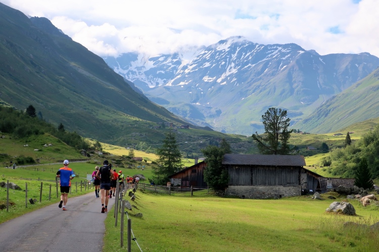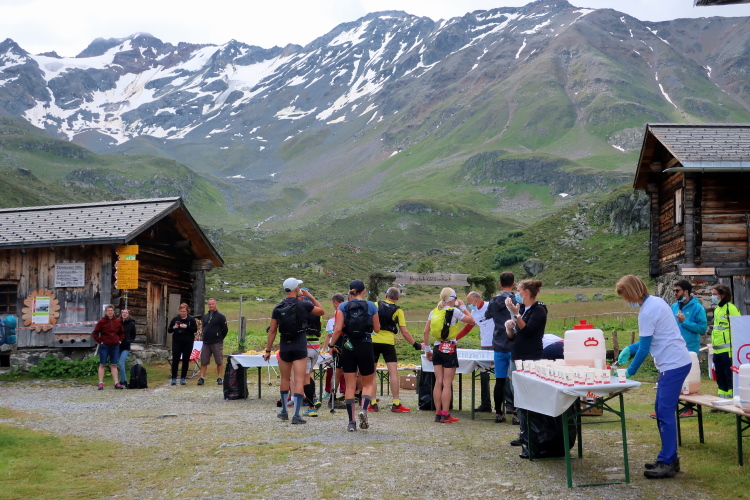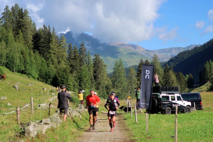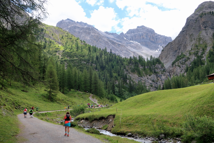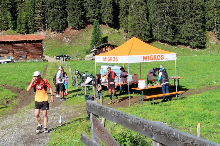 Weiter und höher geht es ins Dischmatal hinein, Kilometer um Kilometer Trailrunning der entspannten Art. Die Berge vor uns bekommen immer mehr Kontur und Dominanz, das Talende rückt näher. Mit dem Weiler Dürrboden bei km 14 erreichen wir sozusagen den letzten Außenposten der Zivilisation im Dischmatal. Hier endet der fahrbare Talweg an einem Parkplatz und es geht nur noch zu Fuß weiter. Der Weiler hat auch historische Bedeutung. Er liegt an der mittelalterlichen Säumerroute, der Via Valtellina, auf der einst Wein und anderes Handelsgut aus dem Veltlin über den Scalettapass in den Norden transportiert wurde. Für die Läufer heißt es, am hiesigen Verpflegungsposten noch einmal Kraft zu tanken, denn jetzt geht es zur Sache. Im letzten Jahr durfte ich hier, bei Wind und Regen, heiße Bouillon genießen. Heuer sieht das Schmalspurprogramm dies nicht vor. Aber energetisch sind Bananen ohnehin die bessere Wahl.