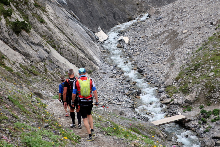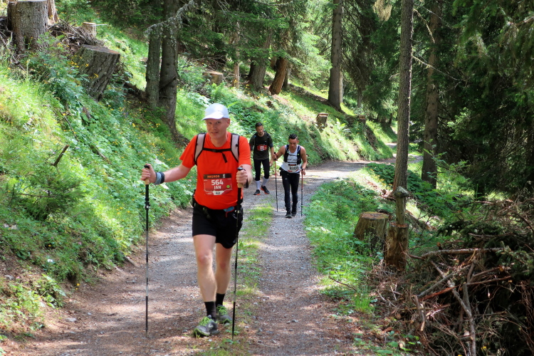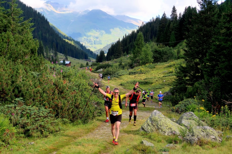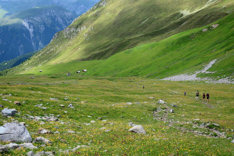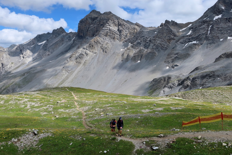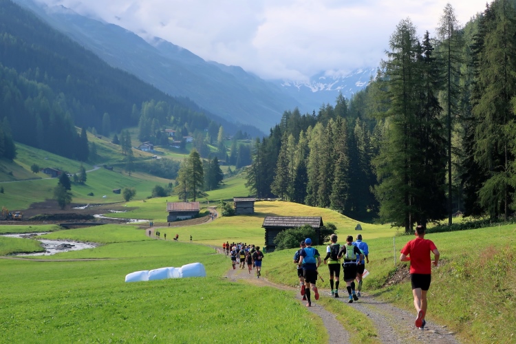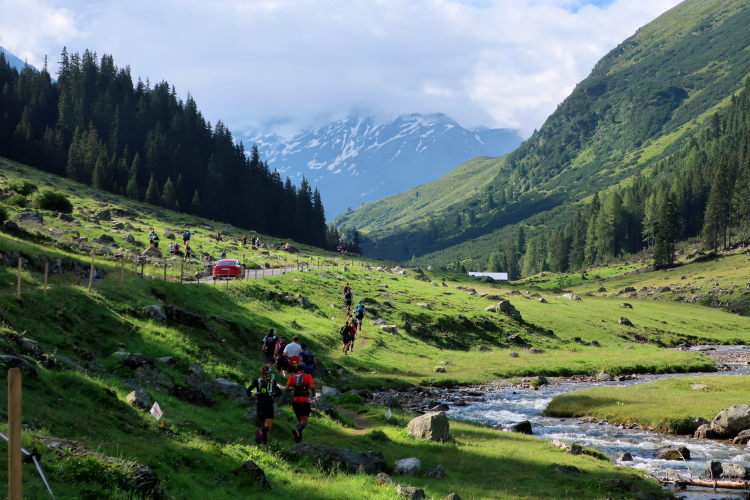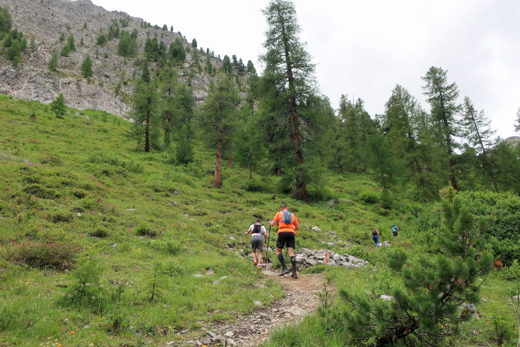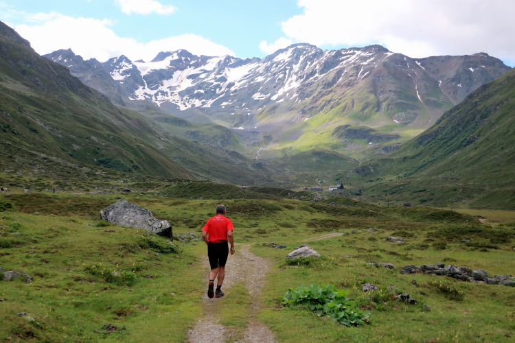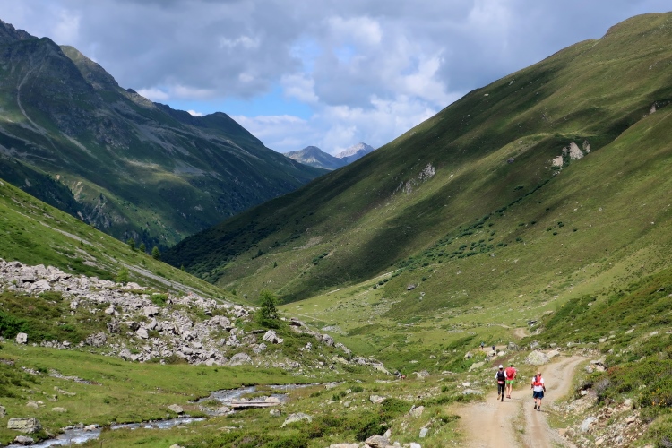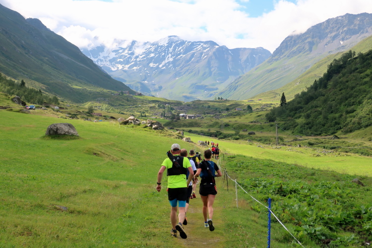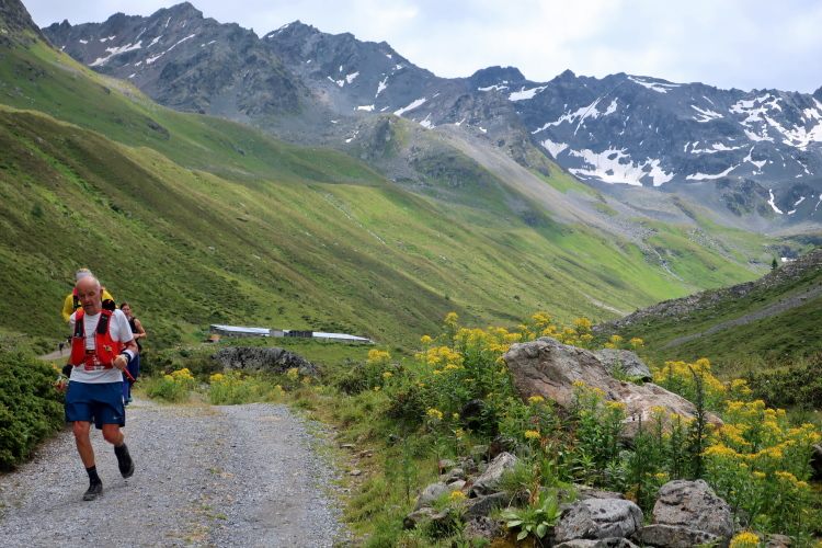 Weiter und höher geht es ins Dischmatal hinein, Kilometer um Kilometer Trailrunning der entspannten Art. Die Berge vor uns bekommen immer mehr Kontur und Dominanz, das Talende rückt näher. Mit dem Weiler Dürrboden bei km 14 erreichen wir sozusagen den letzten Außenposten der Zivilisation im Dischmatal. Hier endet der fahrbare Talweg an einem Parkplatz und es geht nur noch zu Fuß weiter. Der Weiler hat auch historische Bedeutung. Er liegt an der mittelalterlichen Säumerroute, der Via Valtellina, auf der einst Wein und anderes Handelsgut aus dem Veltlin über den Scalettapass in den Norden transportiert wurde. Für die Läufer heißt es, am hiesigen Verpflegungsposten noch einmal Kraft zu tanken, denn jetzt geht es zur Sache. Im letzten Jahr durfte ich hier, bei Wind und Regen, heiße Bouillon genießen. Heuer sieht das Schmalspurprogramm dies nicht vor. Aber energetisch sind Bananen ohnehin die bessere Wahl.
