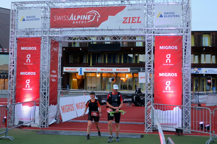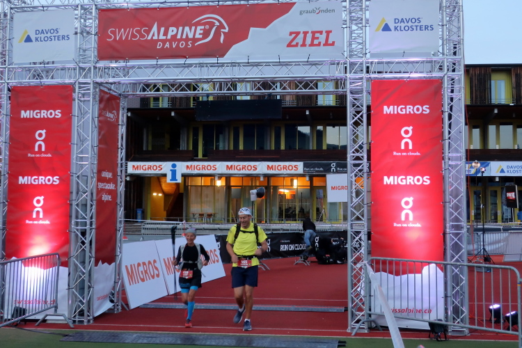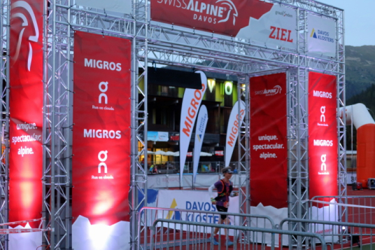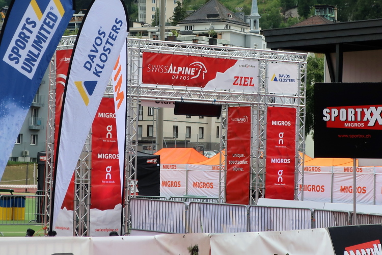 Mystisch lila leuchtet einsam der Zielbogen im weiten Oval des Eisstadions. Es ist nach 21 Uhr und schon ziemlich finster, als ich eintreffe. Vereinzelt tröpfeln die Finisher ins Ziel, angefeuert von einigen nimmermüden Passanten in den Straßen von Davos und über Lautsprecher begrüßt vom Zielmoderator. Erschöpft schauen sie aus, aber auch glücklich. Ein wenig sentimental macht es mich dann schon, es nicht bis ins Ziel geschafft zu haben. Auch wenn ich alles, was es auf dem neuen Kurs des K68 zu sehen zu erleben gab, mitnehmen durfte. Aber überaus froh macht es mich, bei dieser Premiere überhaupt dabei gewesen zu sein.