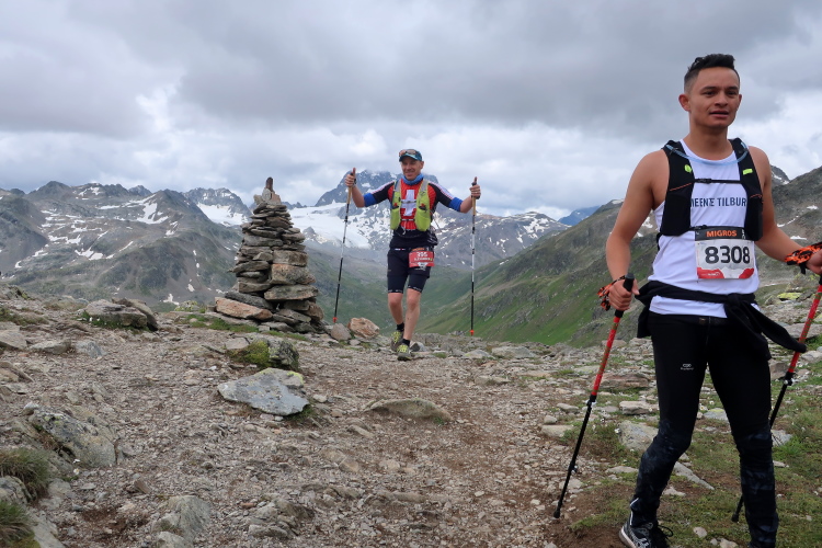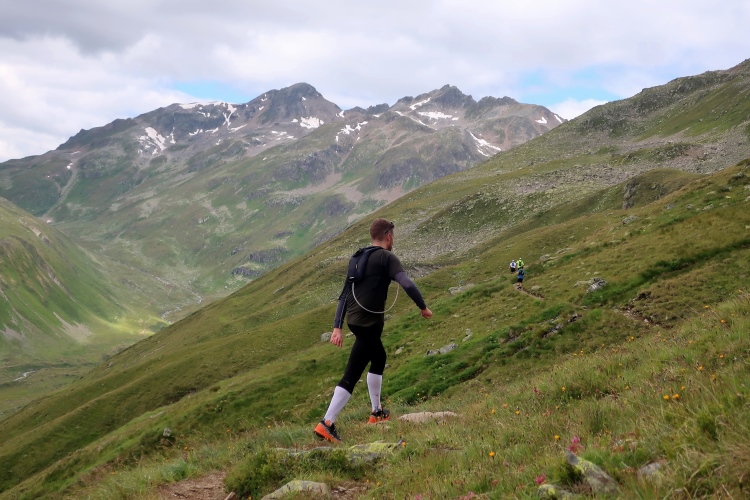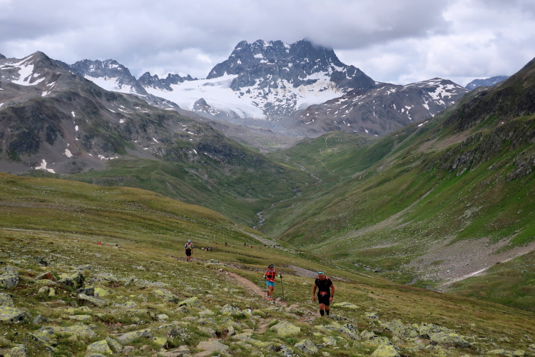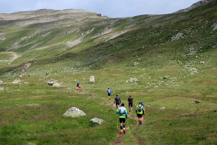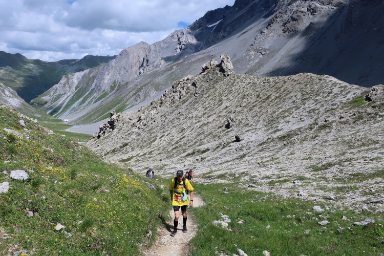 Gleich das erste Wegstück ist besonders steil, dann flacht der Anstieg zwar ab, aber die fern am Horizont sichtbar werdende Passhöhe macht mir zunächst wenig Mut. So weit weg erscheint sie. Durch eine weite, einsame, gleichermaßen felsig-karge wie grün gefleckte Hochgebirgslandschaft windet sich der Pfad weiter und weiter hinauf. Immer wieder halte ich inne, um zu verschnaufen. Vor allem der rückwärtige Blick wird zunehmend beeindruckender. Über die weite abgeschrägte Hochfläche sehe ich bis weit in die Ferne die Punkte der Läufer, die sich empor schleppen und dahinter mächtig aufragend den Piz Kesch. Ein Highlight ist zudem der Ausblick auf zwei kleine weltentrückte Bergseen unweit der Passhöhe.