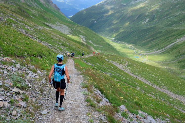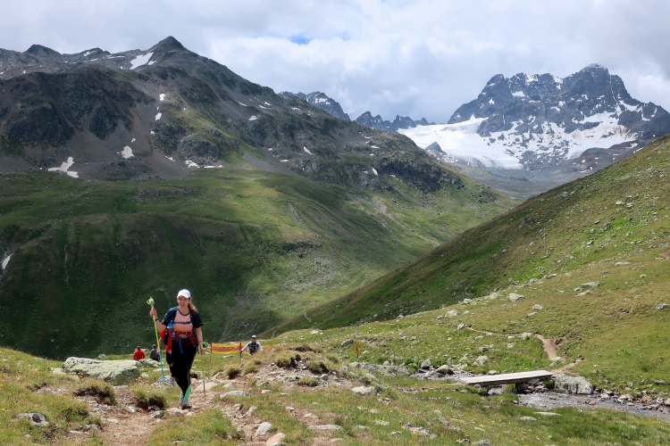 Das zweite große Tal wartet auf uns, nur dieses Mal unter umgekehrten Vorzeichen: Denn es geht downhill. Beeindruckend ist der Blick von der Passkante hinab in das hier oben so wilde, felsige Sertigtal. In steilen Serpentinen windet sich der Pfad durch die Mondlandschaft. Mit schnellen kleinen Trippelschritten versuche ich dem losen Geröll Herr zu werden. Rasant geht es in die Tiefe und ich muss mich fragen, ob mir meine Oberschenkel das im Flacheren nicht heimzahlen werden.