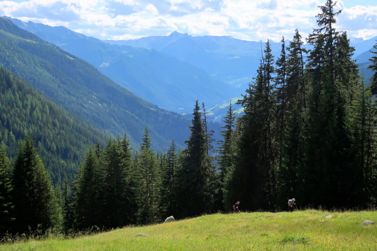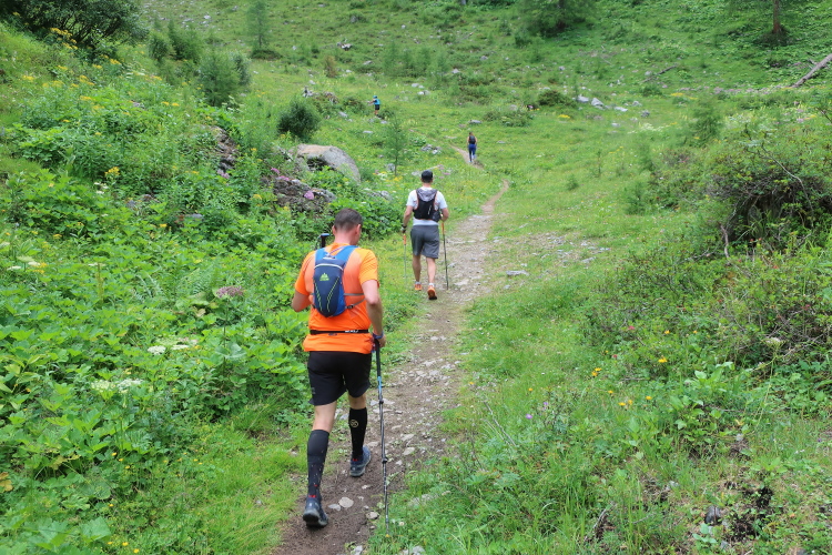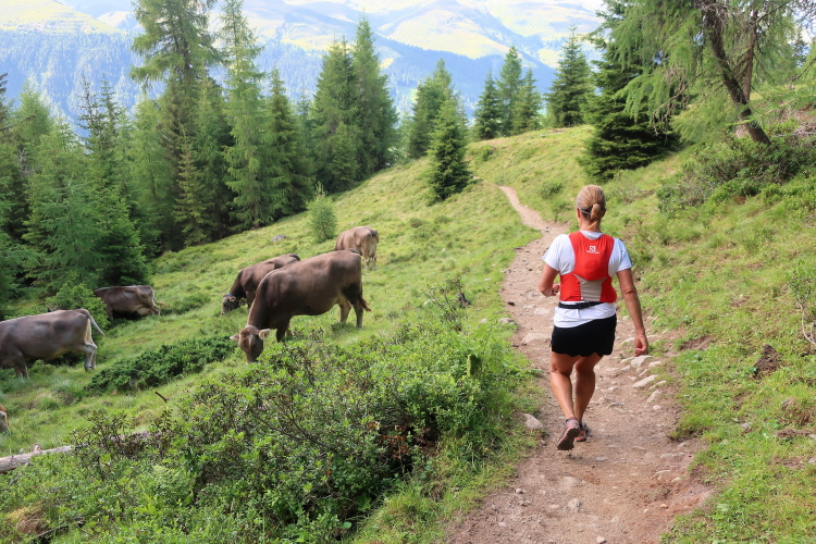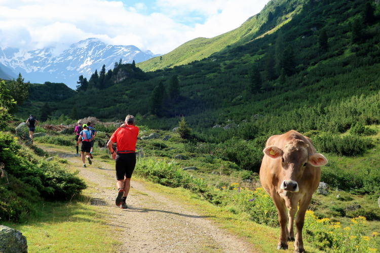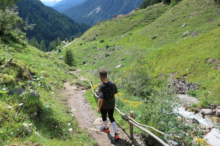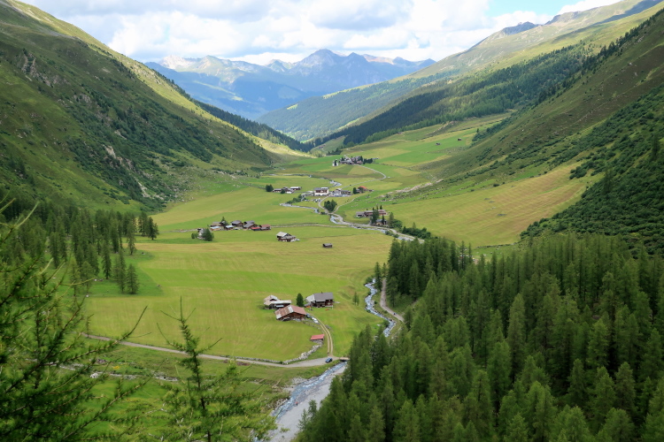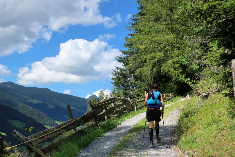 Der Einstieg wird uns leicht gemacht. Auf einem breiten, bequemen Naturweg geht es in entspanntem Trab in leichtem Auf und Ab, freilich mit deutlich höheren „Auf“-Anteilen, durch eine alpine Bilderbuchkulisse. Mitten durch die saftig grünen Wiesen schlängelt sich der Weg im Talgrund. Darin eingestreut sind kleine Weiler und einsame Gehöfte, alles in altem Holz erbaut. Dichter Nadelwald rahmt das Tal links und rechts die Abhänge hinauf. Und an der tiefsten Stelle rauscht der namengebende Bergbach.