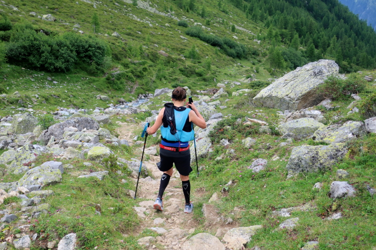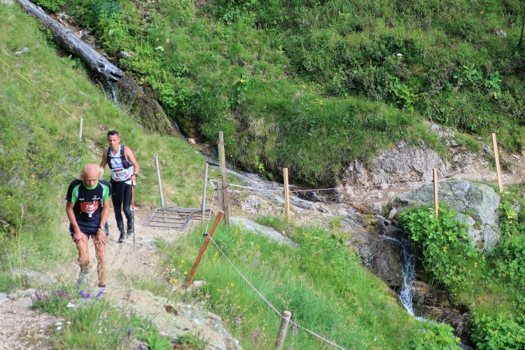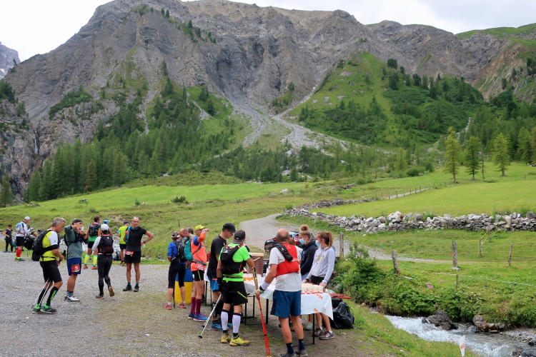 Nicht für die Absolventen des K68: Für sie und auch für die Veranstalter selbst beginnt hier Neuland. Nach links zweigt der Kurs in ein Seitental ab und erreicht unweit eines Wasserfalls und dahinter steil aufragender Felswände bei km 31 den nächsten größeren Verpflegungsposten. Den sollte man zum Kräftetanken nutzen. Denn die nächsten etwa 700 Höhenmeter bis zur Passhöhe Fanzezfurgga stehen bevor. Und die haben es in sich. Was ich in diesem Moment aber noch nicht ahne.