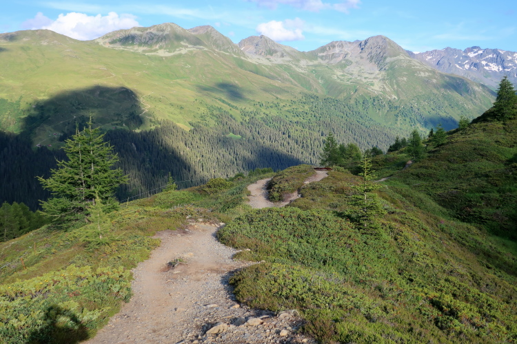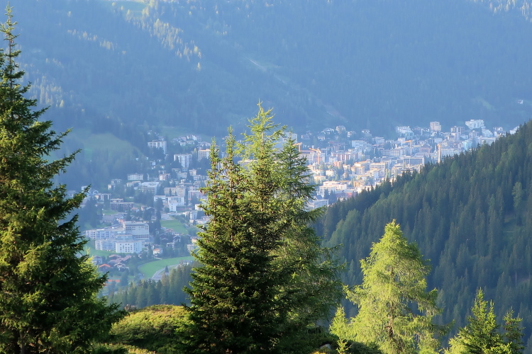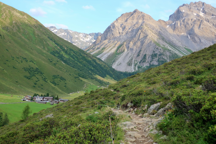 Kaum merklich folgt der Höhenweg dem Abzweig des Landwasser- in das Sertigtal. Für einen Moment sehe ich in der Ferne die Häuser von Davos aus dem Talgrund ragen. Dann geht es über Kilometer einwärts ins Sertigtal hinein. Ganz allmählich gleicht sich das Höhenniveau des ansteigenden Tales dem absinkenden Verlauf des Weges an. Während die Wälder auf der gegenüber liegenden Talseite im abendlichen Licht erstrahlen, wird es auf meiner Seite des Tales kühl und schattig. Der Abend ist bereits fortgeschritten, als ich im grünen Talkessel den Weiler Sertig Dörfli und dahinter eine weitere Häuseransammlung ausmachen kann. Dort muss ich hin und bin schon gespannt, was mich erwartet.
