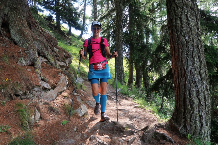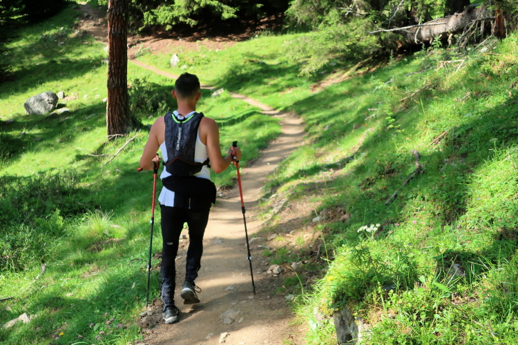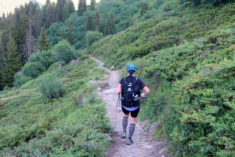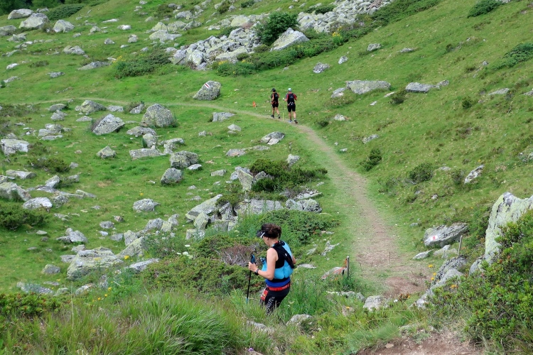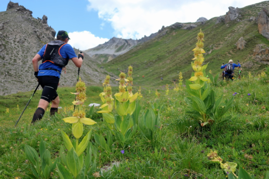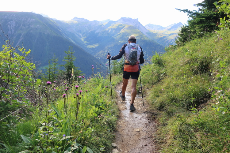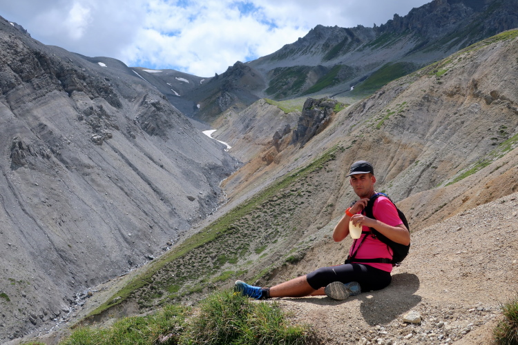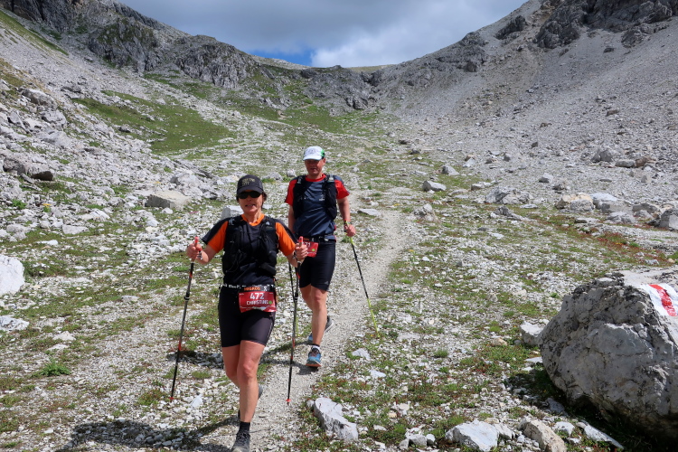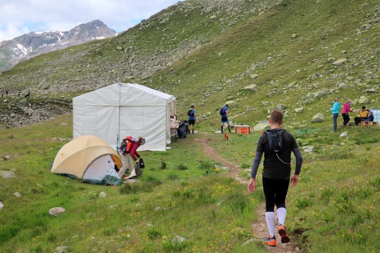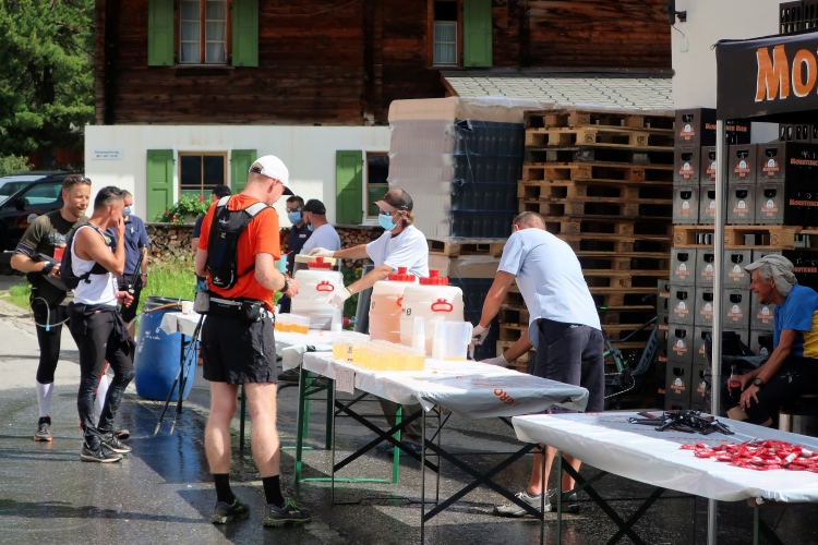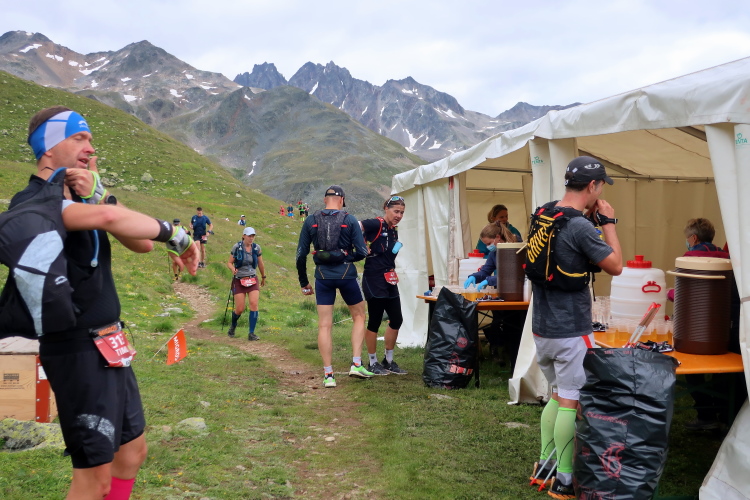 Inmitten der Bergeinsamkeit, an einer der äußerst raren ebenen Stellen im Hang, ist nach 21 km der Versorgungspunkt Tagliöl aufgebaut. Und hier gibt es sie endlich: Eine heiße Bouillon, noch dazu mit Panoramablick. Ein wunderbarer Ort zum Innehalten und um die wärmende, kräftige Flüssigkeit zu genießen.