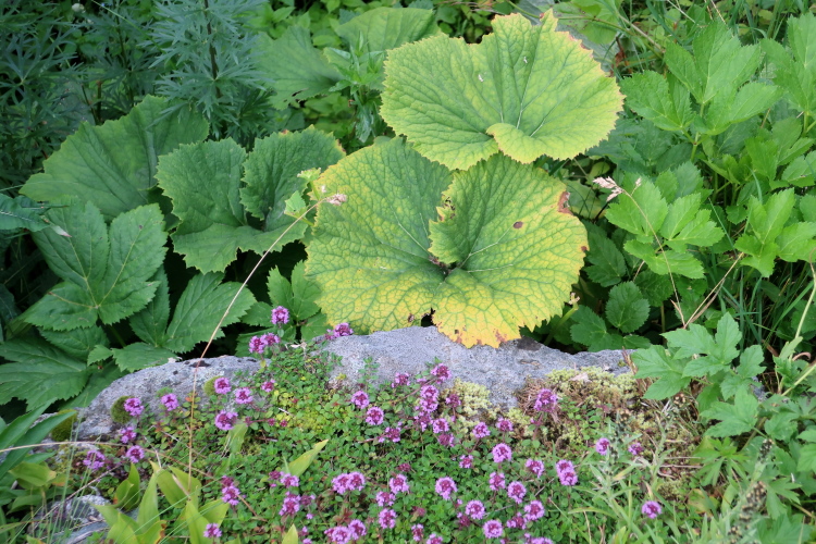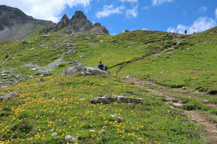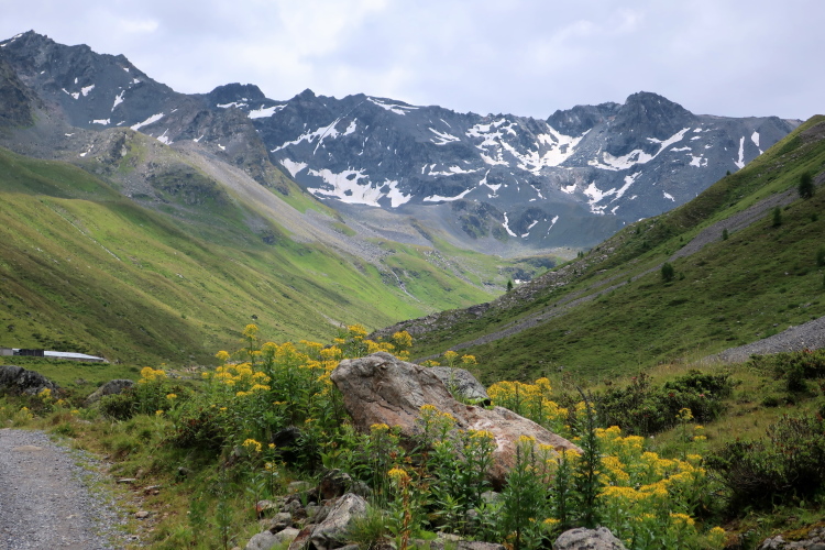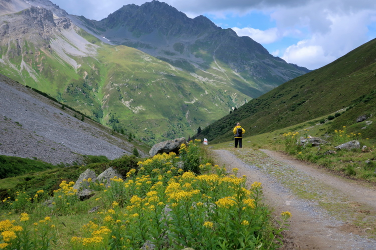 Zur Linken stellen die Ducanen ein unüberwindliches Hindernis dar. Aber auch die übrigen Seiten des Tales scheinen von unzugänglichen Berghängen umschlossen zu sein. Ich frage mich, wo denn hier der Passübergang sein soll. Keine Erhellung bekomme ich bei dieser Frage, während ich immer weiter langsam durch die Weite der Landschaft trabe. Auffallend grün ist der Talboden, häufig blumenbedeckt und wunderschön anzuschauen, gerade im krassen Gegensatz zum menschenfeindlichen Grau der in weiten Geröllhalden auslaufenden Flanken der Ducanen auf der anderen Talseite, bei deren Anblick ich unvermittelt an die Felsungetüme der Dolomiten denken muss. Besonders gefallen mir die vielfach singulär hochwachsenden gelben Pflanzen, die mich an Königskerzen erinnern. Doch leider sind meine botanischen Kenntnisse zu dürftig, um diese Gewächse korrekt einzuordnen.