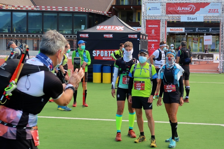 Dass in diesem Jahr vieles anders ist, merke ich schon vor dem Start, denn nicht das Kongresszentrum ist erster Anlaufpunkt vor dem Lauf, sondern die große Eissporthalle mit ihrer beeindruckenden hölzernen Kuppel direkt neben dem Start- und Zielgelände im Herzen von Davos-Platz. Diese ist renovierungsbedingt zwar noch bis 2021 gesperrt und Großbaustelle, aber ihre Katakomben sind nutzbar. Und hier, in einem kurzen spartanischen Einbahnparcours, bekomme ich am Freitag Startnummer und Startbeutel mit nettem Spezialitätenbrett´l. Ein weiterer gelungener Einfall: Mittels gescanntem QR-Code bekommt jeder Starter ein nettes Erinnerungsbild – politisch korrekt mit Maske und digital hinterlegter wilder Berglandschaft.