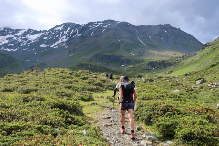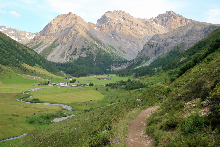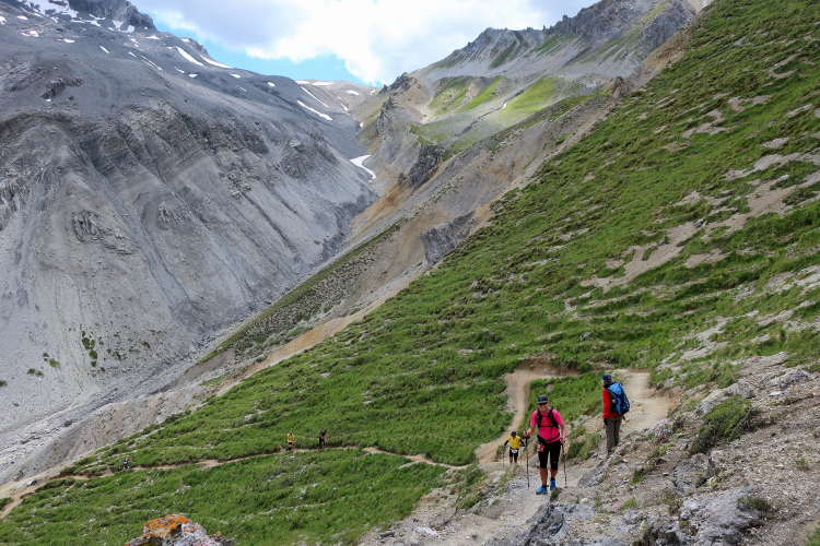 Aus dem Seitental zweigen wir nach rechts ab ins Haupttal, das Val Funtauna. Hoch über dem Talgrund setzen wir unseren Weg auf dem Panoramatrail fort. Überholen ist kaum möglich, sodass sich immer wieder kleine Kolonnen bilden und vor manchen Hindernissen, etwa ausgesetzten Felsstellen oder rauschenden Bergbächen, gar stauen. Es hier eilig zu haben, wäre aber ohnehin ein Fehler, denn überragend ist die Bergkulisse. In einem ungemein intensiven Grün leuchten die sich aus dem Tal weit in die Höhe ziehenden Grasmatten. Darüber ragen in düsterem Grau und lichtem Weiß unnahbar die Berggipfel, allen voran am Horizont der monolithisch herausragende Piz Kesch, mit 3.418 m die höchste Erhebung der Albulaalpen.