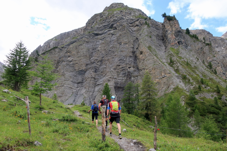 Steil geht es sofort los, auf einem weichen Pfad durch luftigen Lärchenwald. Schnell gewinnen wir an Höhe, was schließlich mit einem weiten Blick hinab ins tief unter uns liegende Sertigtal belohnt wird. Näher rücken wir den schroffen, fast senkrecht abfallenden Felswänden und blicken nach Überschreiten einer Stufe hinab in ein tiefes, enges Tal. Wir stehen am Eingang des Ducantales. Überaus imposant und in wilder Schroffheit unnahbar zieht sich jenseits des Talgrundes der graue Riegel der Ducanen entlang, deren Gipfel bis in eine Höhe von 3.063 m reichen. Ein kurzer Abstieg führt uns hinab, hin zum wild rauschenden Ducanbach, den wir eingangs über eine kleine Brücke queren, um den Weg auf der anderen Seite über einen im steilen Hang schnell an Höhe gewinnenden Pfad fortzusetzen.
