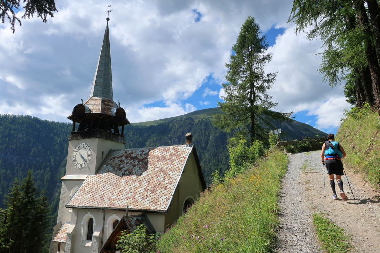 Vorbei an der exponiert am Ortsrand gelegenen neuen Dorfkirche stapfe ich zunächst noch wohlgemut den eigentlich bequemen und breiten, nur eben leider auch arg steilen Forstweg nach oben und tauche ein in dichten Wald. Doch der Weg und die Steigung wollen kein Ende nehmen und so sinkt analog zu Kraft und Motivation auch mein Tempo. Verschnaufpausen sind angesagt und als ich die Hauderalp auf 1.987 m üNN erreiche, sinke ich erschöpft auf eine Holzbank und bleibe erst einmal sitzen. War ich in Monstein noch optimistisch, es innerhalb der Sollzeit nach Davos zurück zu schaffen, wird mir jetzt klar, dass ich dazu heute wohl nicht mehr in der Lage bin.