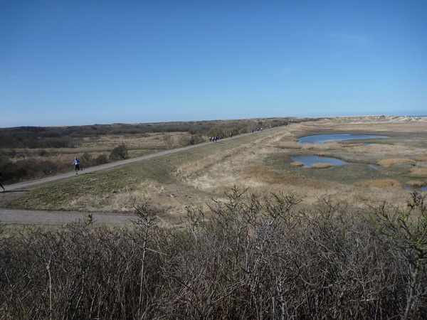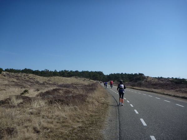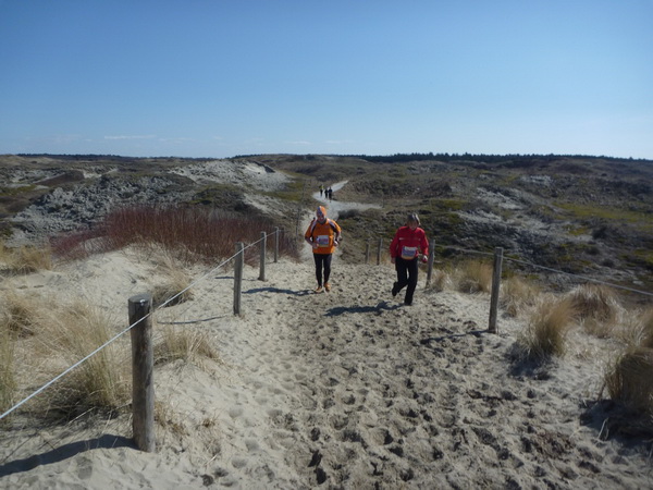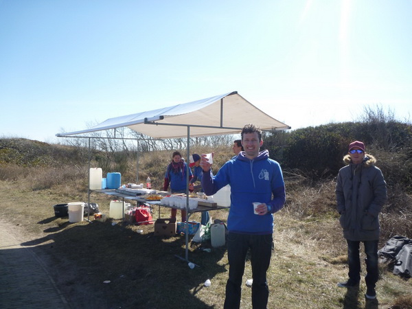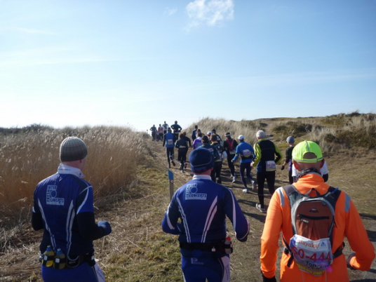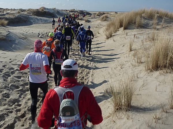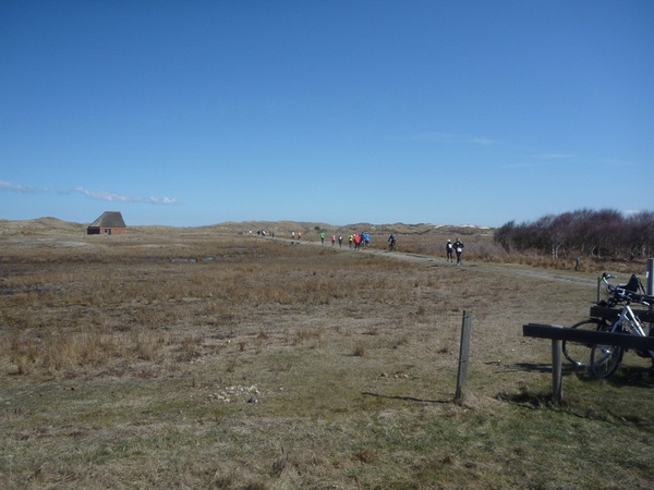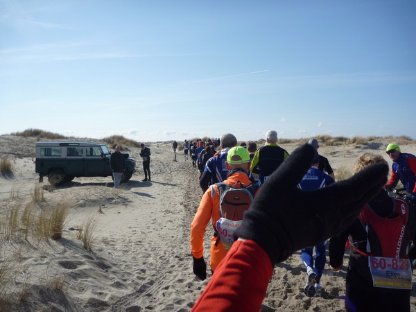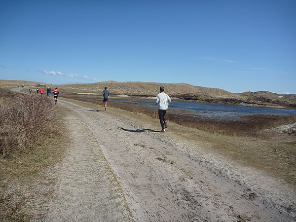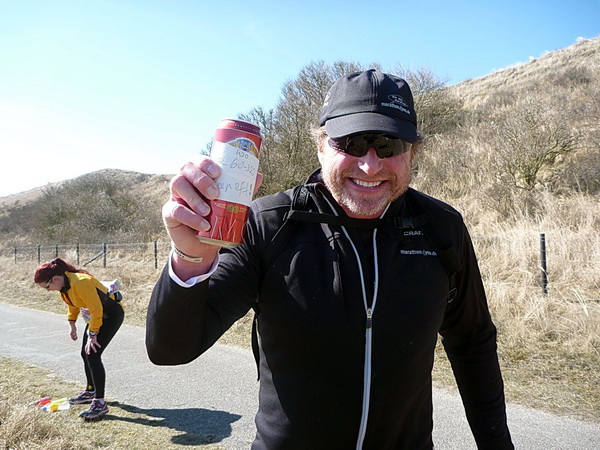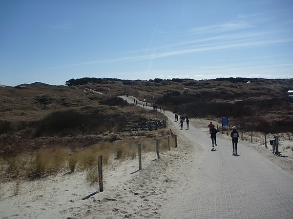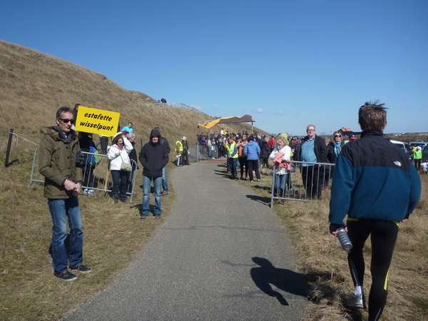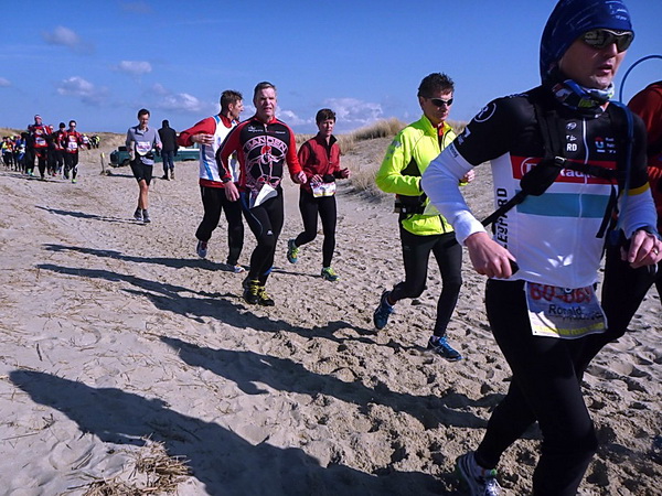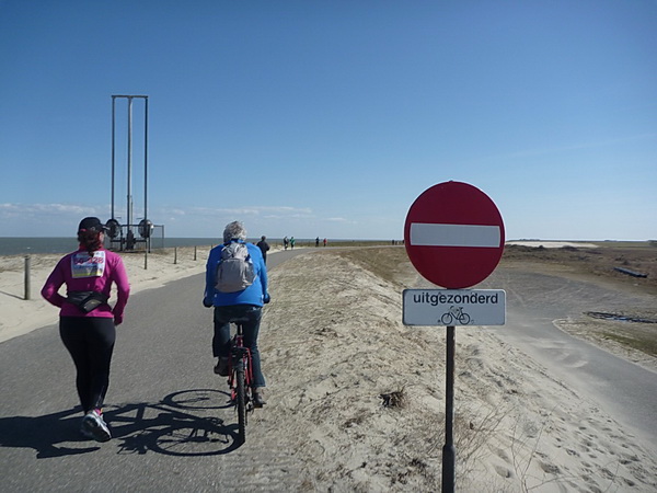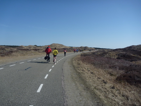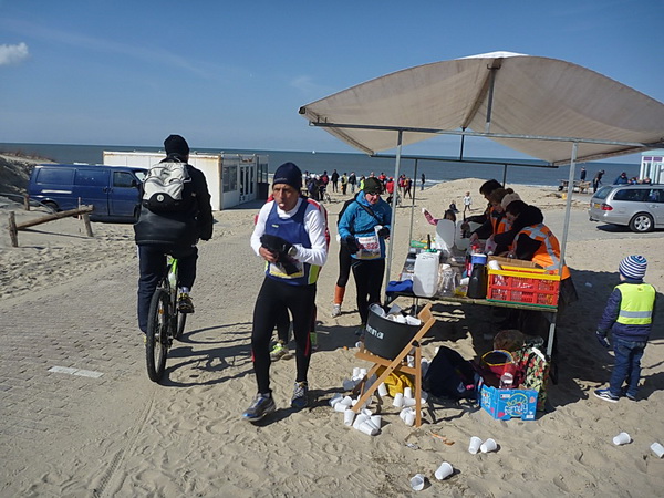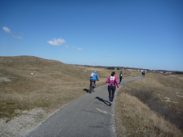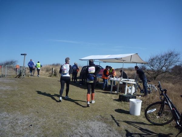 Rauf auf die Dünen, Verpflegungsstation. Ein wenig verständnislos bin ich über die hier wartenden Fahrradbegleiter. Wozu brauchen Staffelläufer Fahrradbegleitung? Es sind die Nichtläufer der Laufvereine. Es geht nicht um Hilfestellung, sondern um das gemeinsame Erlebnis. Sie stören nicht, es ist ok und eine gute Idee, so Familienmitglieder und Freunde am Lauf teilhaben zu lassen.