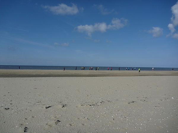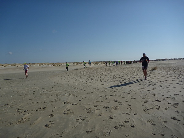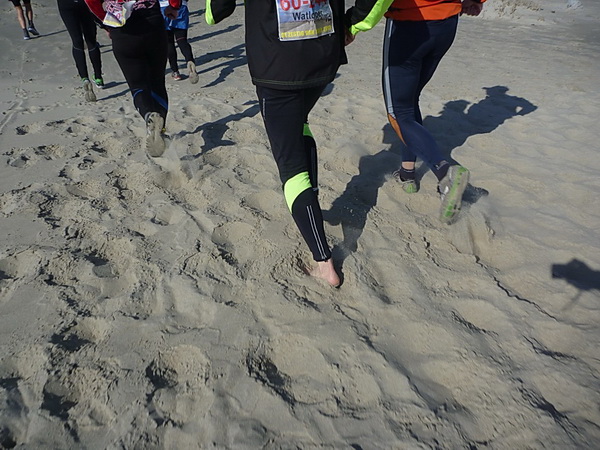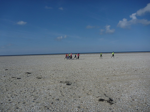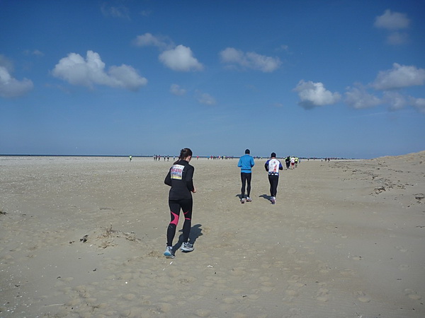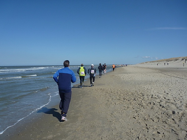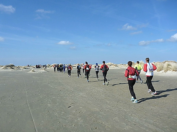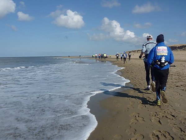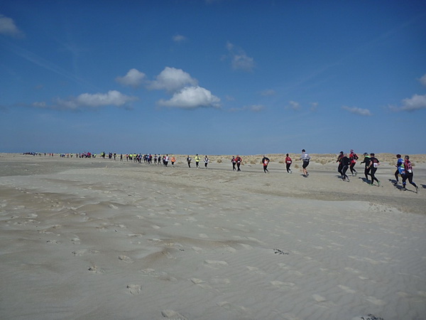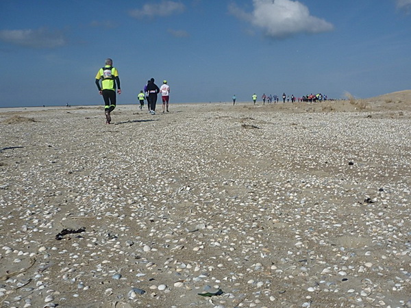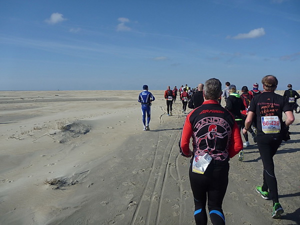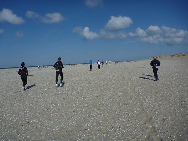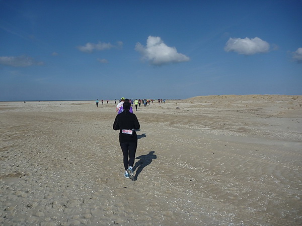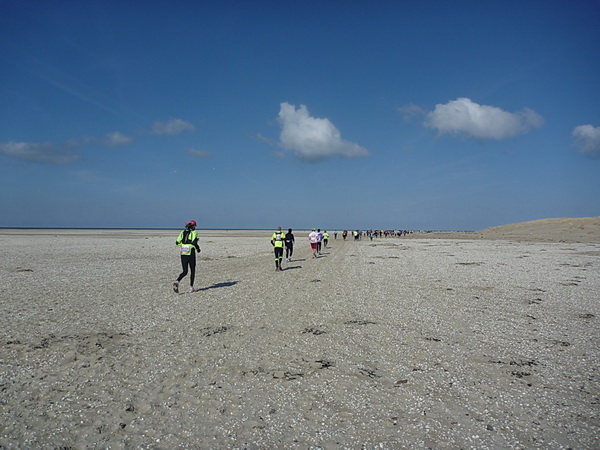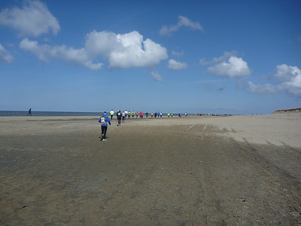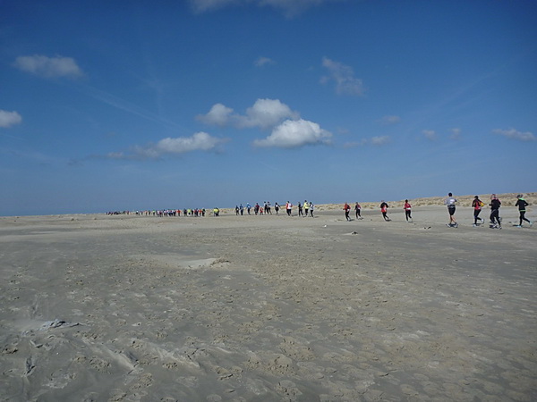 Nicht allzu schwierig zu laufen, nur stellenweise wird der Sand tief. Ein “Wattloper” läuft barfuß über die scharfen Kanten der Muscheln. Die Schlange der Läufer teilt sich in mehreren Gassen auf, ich kann weit hinaus laufen und aus der Ferne Fotos schießen, sagenhafte Bilder. Manchmal trennen mich Priele oder kleine Seen vom Rest der Truppe, dann suche ich mir einen Weg, hole mir nasse Füße. Der Strand wird schmaler und wir versuchen den Wellen auszuweichen. Die Schräge des Untergrundes macht sich schmerzhaft in den Fersen bemerkbar. Immer mehr Staffelläufer überholen mich. Einsam steht ein km 40-Schild im Sand, die km werden herab gezählt. Mir wird klar, dass ich das Zeitlimit von 7 Stunden nicht einhalten kann.