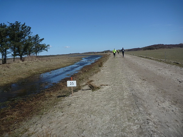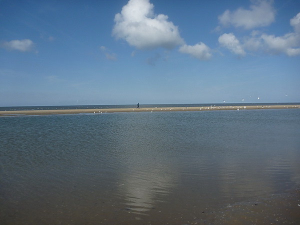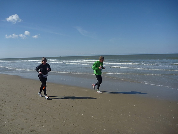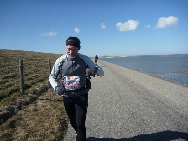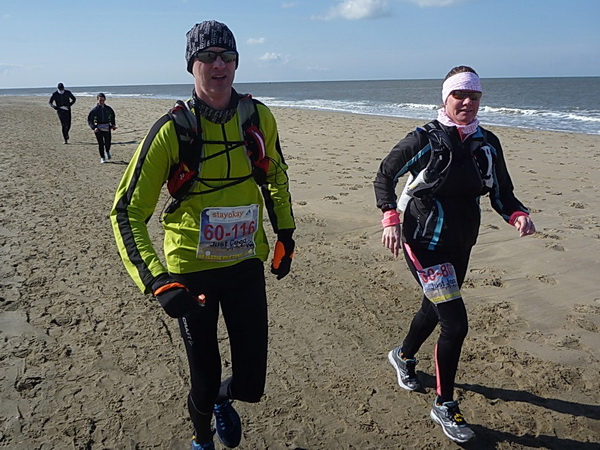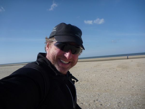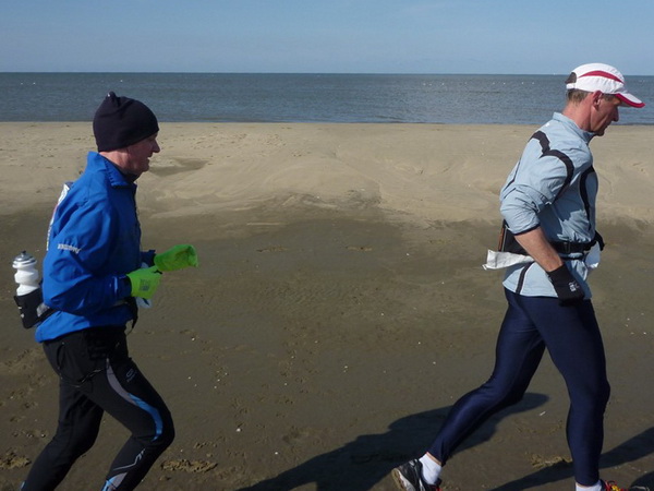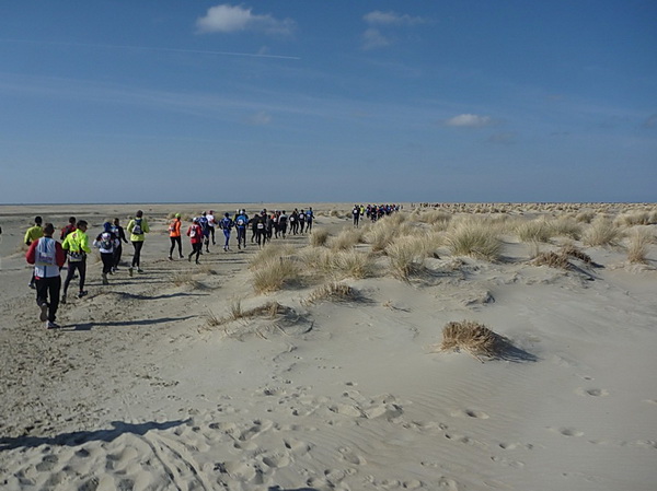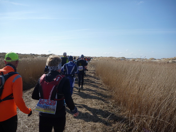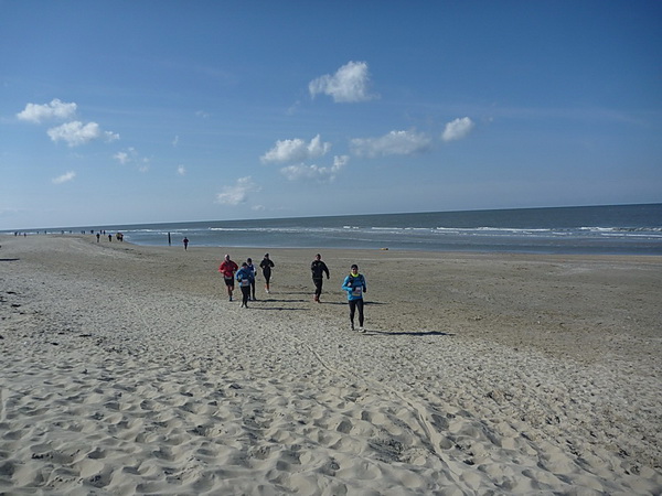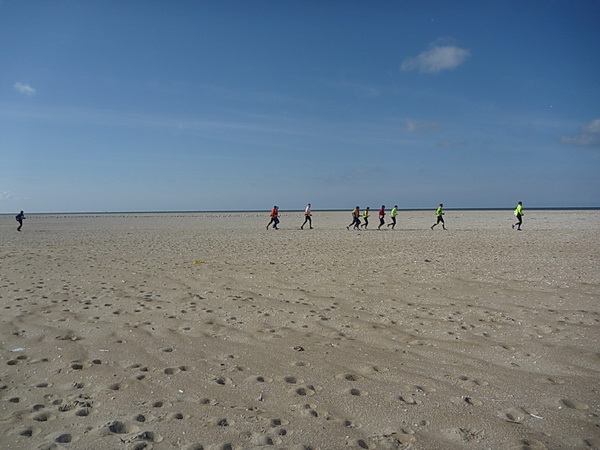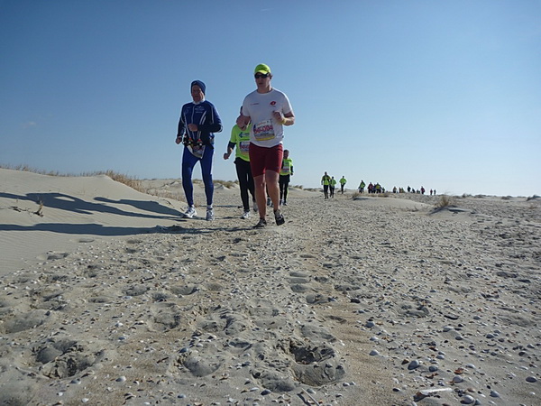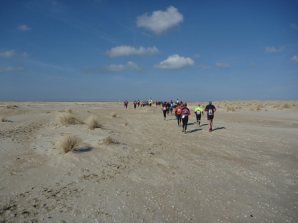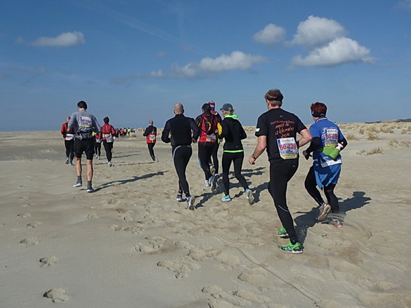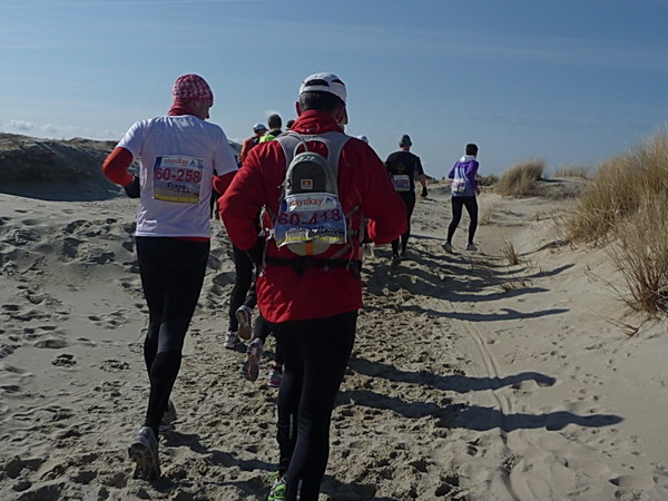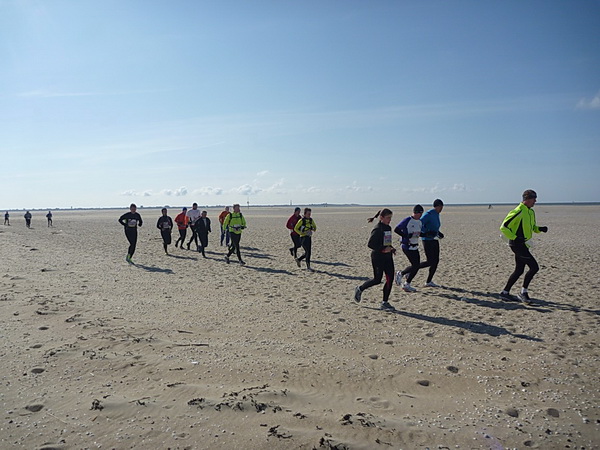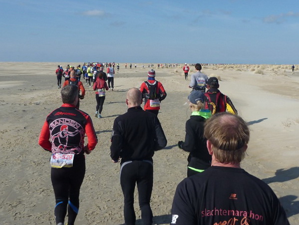 Nicht allzu schwierig zu laufen, nur stellenweise wird der Sand tief. Ein “Wattloper” läuft barfuß über die scharfen Kanten der Muscheln. Die Schlange der Läufer teilt sich in mehreren Gassen auf, ich kann weit hinaus laufen und aus der Ferne Fotos schießen, sagenhafte Bilder. Manchmal trennen mich Priele oder kleine Seen vom Rest der Truppe, dann suche ich mir einen Weg, hole mir nasse Füße. Der Strand wird schmaler und wir versuchen den Wellen auszuweichen. Die Schräge des Untergrundes macht sich schmerzhaft in den Fersen bemerkbar. Immer mehr Staffelläufer überholen mich. Einsam steht ein km 40-Schild im Sand, die km werden herab gezählt. Mir wird klar, dass ich das Zeitlimit von 7 Stunden nicht einhalten kann.