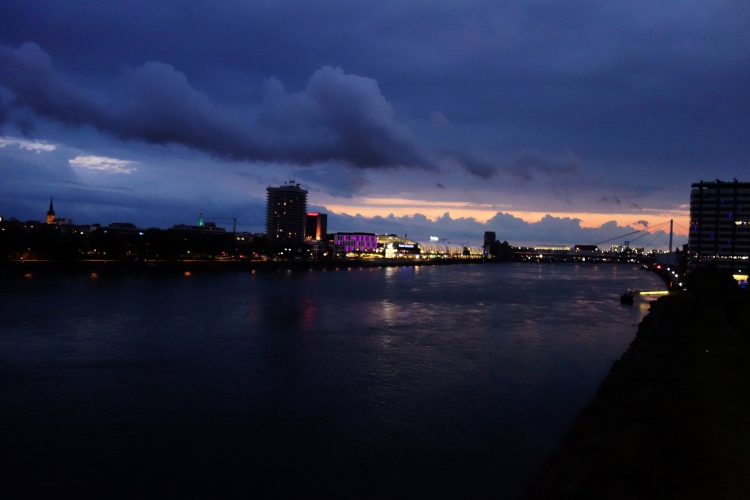 Mit der letzten Helligkeit erklimmen wir die Hochstraße über dem Handelshafen. Ein leichter, warmer Abendwind empfängt uns. Kein Autolärm dringt durch die Stille. Die letzten Straßenlampen schalten sich an. Es ist unbeschreiblich schön. Auf der Kurt-Schumacher-Brücke mit ihren imposanten Tragseilen überqueren wir den Rhein. Links leuchtet das weiße Kuppeldach eines riesigen Einkaufszentrums.