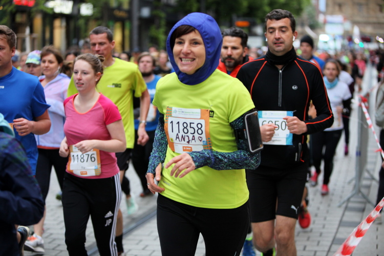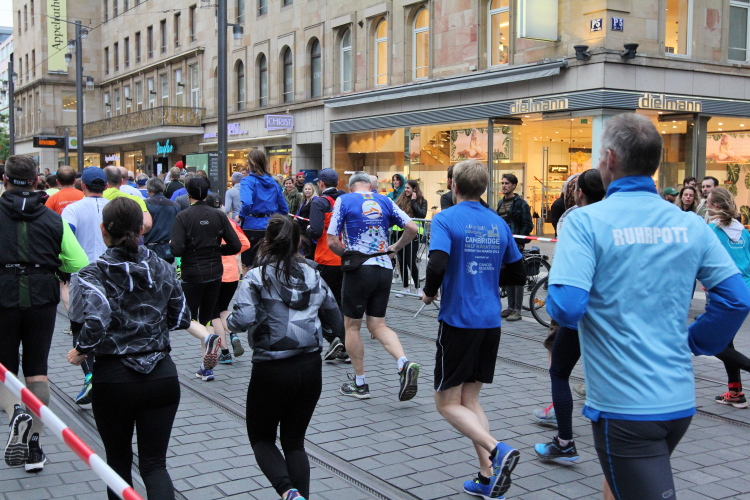 Ich sauge das für mich eher ungewohnte Citylauf-Feeling ein. Die vielen, vielen Zuschauer auf und neben der Tribüne machen ein Höllenspektakel. Helfer überreichen Medaillen im Akkord. Dann geht es zur Zielverpflegung. Die Stände sind voll mit Essen und Getränken. Wasser, Cola, Iso und Bier mit und ohne Alkohol, Laugenstangen und Brötchen, süße Hefeteile, Bananen und Äpfel. Was will man mehr?