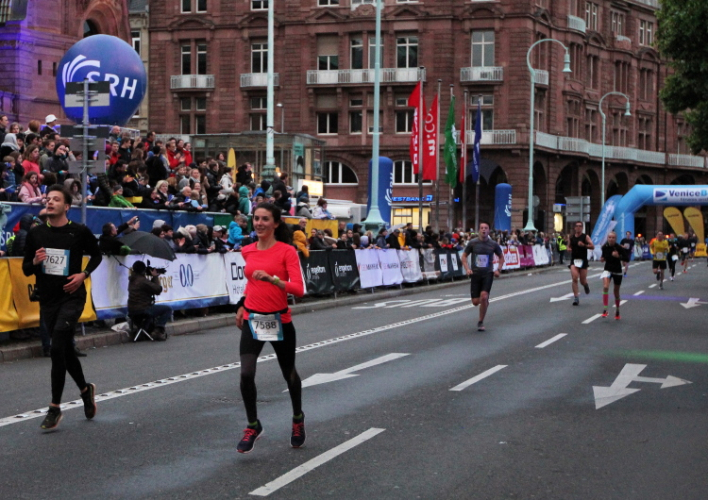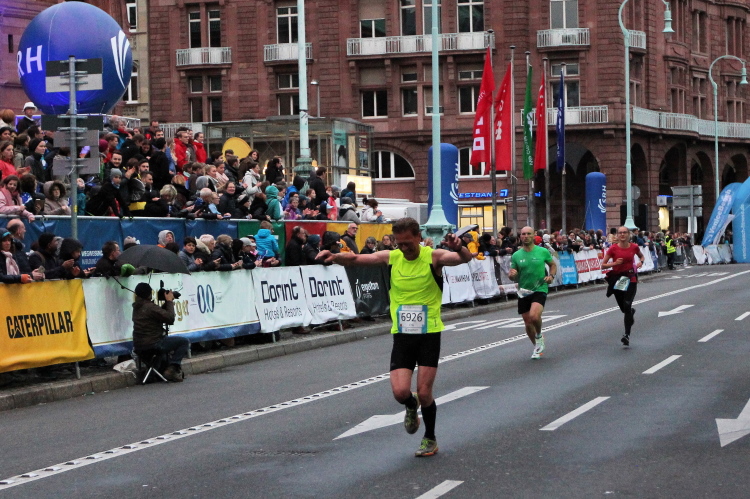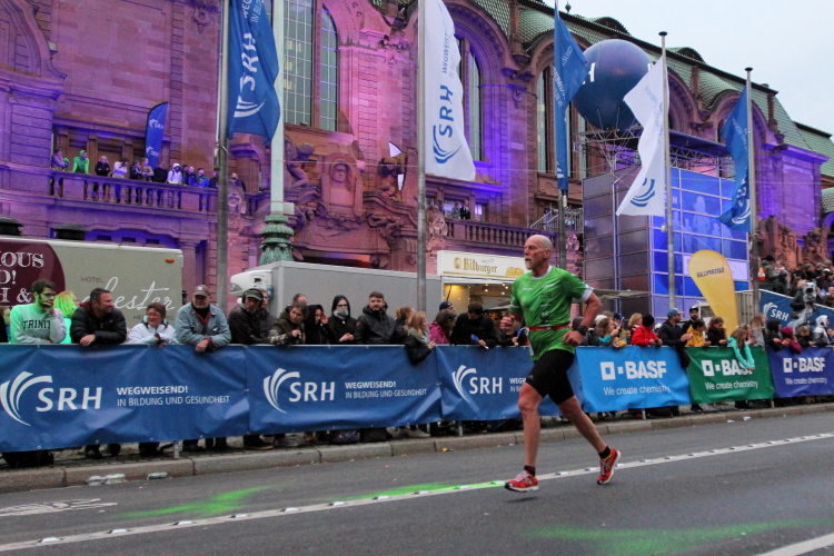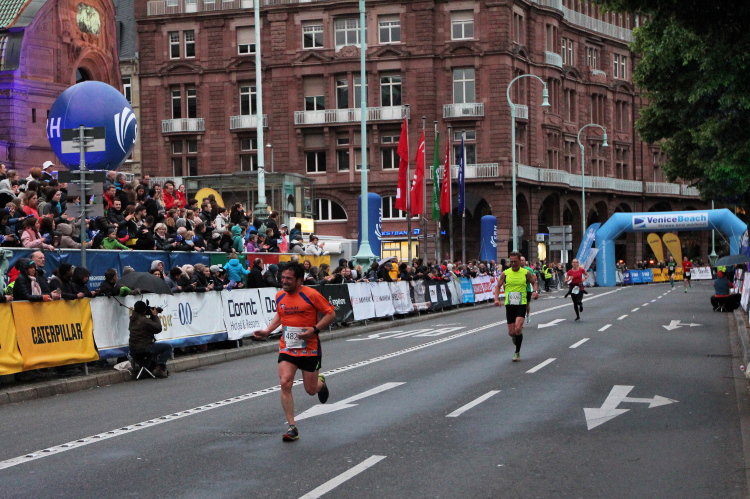 Weiter, die Zeit passt. Dann der Wasserturm, rechts das große Maritim-Hotel, dann die Kunsthalle Mannheim. Dieser Halbbogen zieht sich endlos. Wann sind wir endlich da? Ich sehe den Rosengarten blau angestrahlt. Vorsichtiger Blick nach hinten. Da überholt keiner mehr. Nach 4:17 Stunden erreiche ich das Ziel, drei Minuten später als Judith. Wunderbar. Eine Medaille mit der Abbildung des Wasserturms wird mir umgehängt.