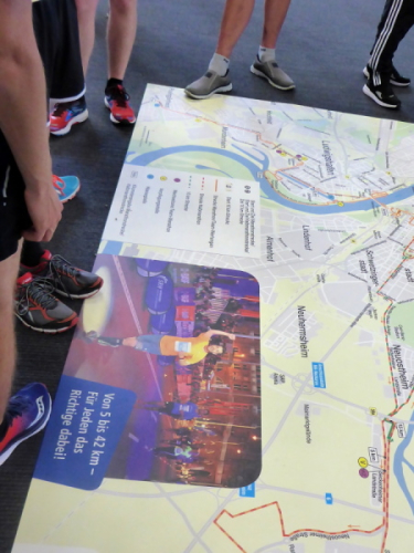 Die Startunterlagen gibt’s im obersten Stock. In der Startertasche finden wir eine Faltflasche, Ohrhörer, einen Schwamm, Traubenzucker und den Hinweis, dass man aus Umweltschutzgründen auf gedrucktes Material verzichtet. Gutscheine und Flyer sind dafür im Internet in einer virtuellen Startertasche verfügbar. Eine gute Idee wie ich finde.
