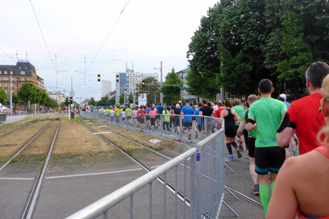 Wir machen uns zeitig auf in die Augustaanlage, wo man laut Ausschreibung bis spätestens 18 Uhr 30 im Startblock sein sollte. Diese ist eigentlich nur wenige Meter entfernt. Da auf der Straße vor dem Rosengarten allerdings gerade der Zieleinlauf des 10 km Laufs stattfindet, ist der Weg dorthin mit Menschenmassen zugestopft. Wir wenden uns deshalb nach links in die Seitenstraßen, um das Chaos zu umlaufen. Hier in der Tullastrasse gibt es Dixie Toiletten und etwas nach hinten versetzt befinden sich die Duschanlagen.