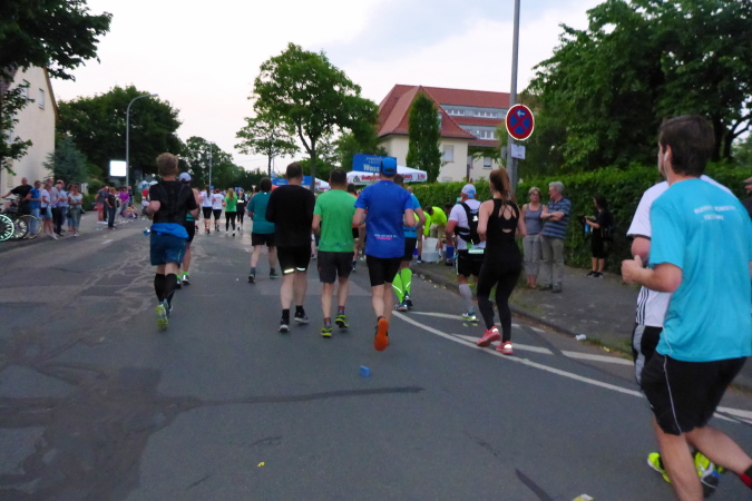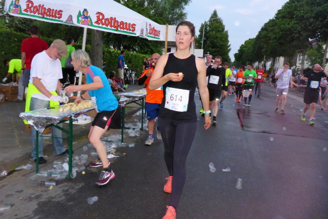Am Wasserturm von Seckenheim macht die Strecke ein Spitzkehre und führt auf der Badener Straße weiter. Die Feste am Straßenrand nehmen kein Ende; hier ist fast noch mehr los als vorhin. Bevor wir in die Hauptstraße einbiegen, gibt es erneut Wasser zur Erfrischung, aber auch Iso, Banane und Riegel (km 12).