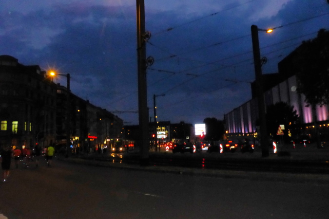 Nachdem wir die A6 unterquert haben, erkenne ich es auch: die andere Straßenseite wird bereits gereinigt. Dort waren wir bei km 5. Jetzt laufe ich am km 14 Schild vorbei. Die Strecke trennt sich erneut, wir laufen nach rechts. Sie läuft wieder zusammen und trennt sich endgültig. Bei km 15 geht es auf einem Radweg entlang; rechts von uns fließt der Neckar. In der Dämmerung erreichen wir den Luisenpark. Diesen Park gibt es schon seit 1900. Seine jetzige Größe und Aussehen erhielt er aber 1975 anlässlich der Bundesgartenschau. Damals wurde auch der Fernmeldeturm gebaut, Mannheims modernstes Wahrzeichen und mit 212 m höchstes Bauwerk der Stadt. Wir laufen jetzt direkt darauf zu. Zu seinen Füßen befindet sich die nächste VP mit einem schönen Stimmungsnest. Eine Musik- und kleine Lightshow verzaubert die Läufer.