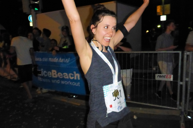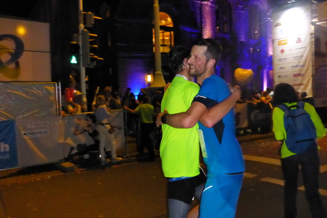 Schon von Weitem können wir nun die Stimme des Sprechers hören. Wir erreichen den Friedrichsplatz, den wir noch einmal umrunden müssen. Während über Lautsprecher gut zu hören der Marathonsieger Nikki Johnstone interviewt wird, kommt für mich das Ziel in Sicht. Ich würde gerne Fotos machen, um die grandiose Stimmung im Ziel festzuhalten, aber es ist leider schon zu dunkel.