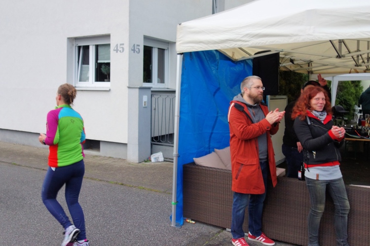 Szenenwechsel bei Kilometer 10. Wir kehren quasi um und laufen jetzt wieder Richtung Mannheimer Zentrum. Aber halt: Erst kommt Downtown Seckenheim. Verhalten bauen sich die Stimmungsnester auf, bevor sie in der Badener Straße den Höhepunkt erreichen und uns bis Km 12,5 durch den Ort tragen. Es wirkt auf mich so, also ob die Bewohner wirklich jedes Jahr diesem Lauffest entgegenfiebern. Überall sitzt man in Hofeinfahrten oder grillt unter dem Grillport, der das restliche Jahr über als Carport ein trostloses Leben führt. Unzählige Kinderhände gilt es abzuklatschen. Ein Weber-Grill in SUV-Größe wartet auf seinen Einsatz.