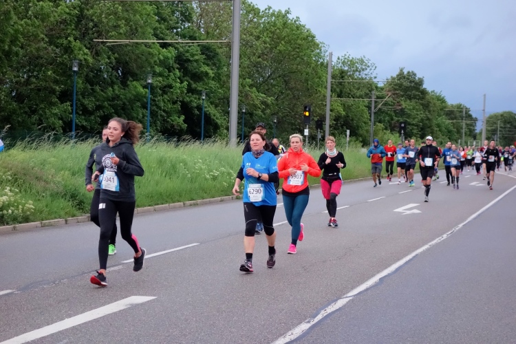 Die Umrundung von Seckenheim steht an. Auf dem Radweg der Neuostheimer Straße geht es unter Hochspannungsleitungen voran. Ich mache eine Bemerkung zur Erdverkabelung im Fichtelgebirge und bin froh, dass sich niemand auf den Schlips getreten fühlt. Beim Laufen sollte man Politisches besser unerwähnt lassen. Dafür wissen die Halbmarathonis von der Orthopädiepraxis Ness meinen Zuspruch zu schätzen. Ich freue mich immer über medizinische Unterstützung beim Laufen. Wobei auch der Veranstalter viele DRK-Stellen aufgeboten hat.