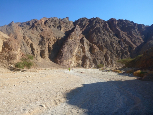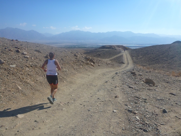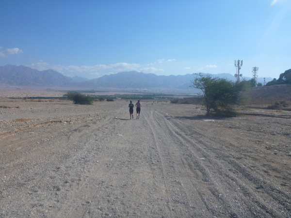 Der Untergrund ist wieder fester und wesentlich einfacher zu laufen. Es geht voran. Das Ende ist absehbar. Das beflügelt. Im Hintergrund sind schon die ersten Hochhäuser von Eilat zu erkennen.