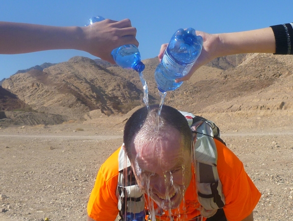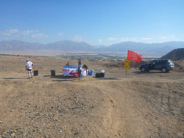 Wir laufen nur ein Stück den Roded Creek zurück. Noch vor Km 31 biegen wir Richtung Eilat ab. Ich beobachte freundliche Helfer, die die herumliegenden Wasserflasche einsammeln. Insgesamt sollen 4.000 Helfer im Einsatz sein. Ihnen gebührt Dank. Stundenlang in praller Sonne ohne Schatten zu stehen, ist auch eine Leistung.