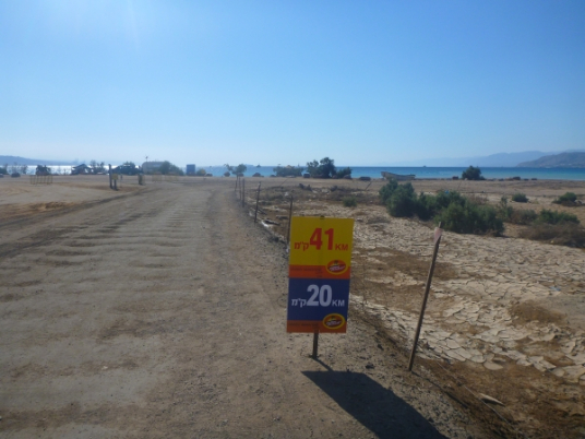 Zwei Radfahrer kommen mir entgegen. Wir laufen auf einer markierten Radroute. Bevor wir die Hochhäuser erreichen, werden wir nach links hinunter geführt und biegen an einer WS nochmals nach links ab. Somit laufen wir wieder von Eilat weg. Irgendwo müssen ja die noch zu laufenden 8 Km absolviert werden.