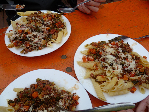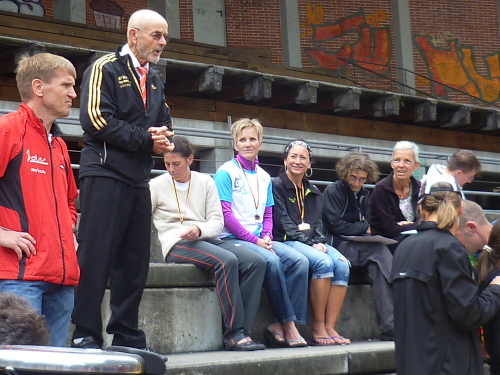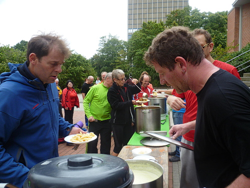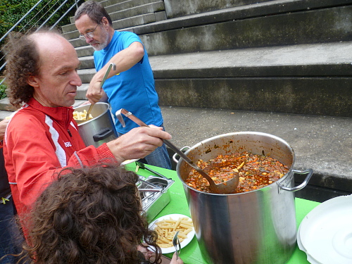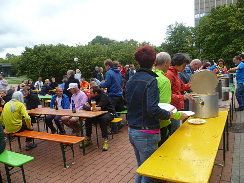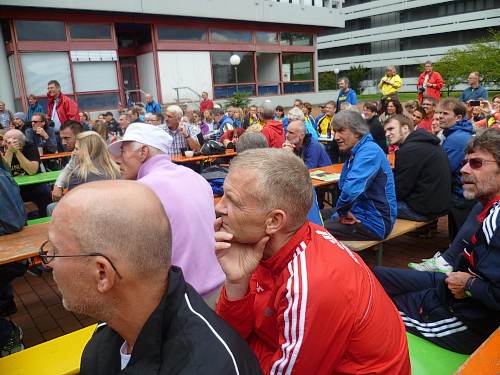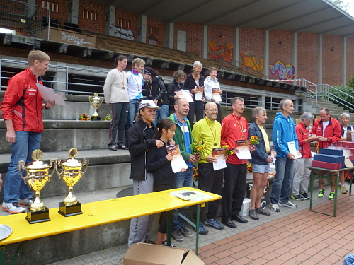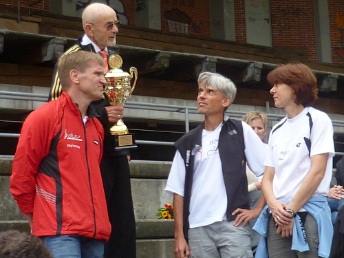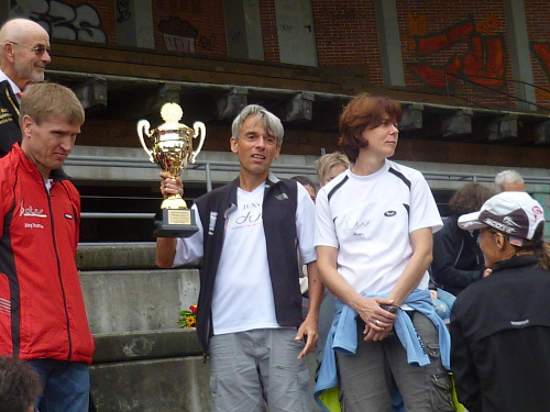 Nach dem Schlusssignal warten wir am Auto auf die Restmetervermessung. Natürlich ist wieder Maya dabei. Nach Duschen und Umziehen treffen sich alle auf dem Gelände des alten Stadions. Dort betreibt der AKK (Arbeitskreis Kultur und Kommunikation der Uni) ein Café. Die Getränke sind spottbillig und wir greifen gerne zu. Im Hof zum Stadion hin sind bereits Biertische aufgebaut. Es gibt Nudeln mit verschiedenen Soßen. Im Rahmen der Siegerehrung überreicht Harry Arndt, Ehrenpräsident und Gründer der Dt. Ultramarathonvereinigung, nach feierlichen Dankesworten einen riesigen Pokal an Maya und Jens Lukas für die gelungene Veranstaltung.