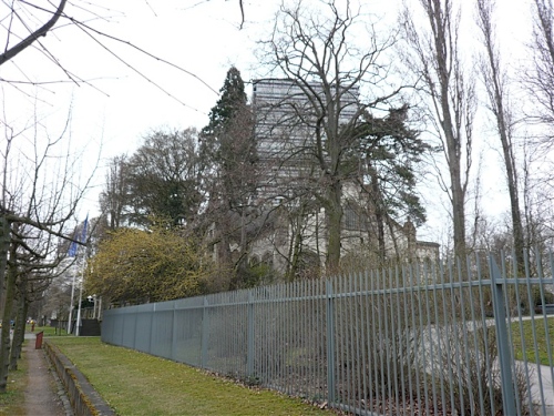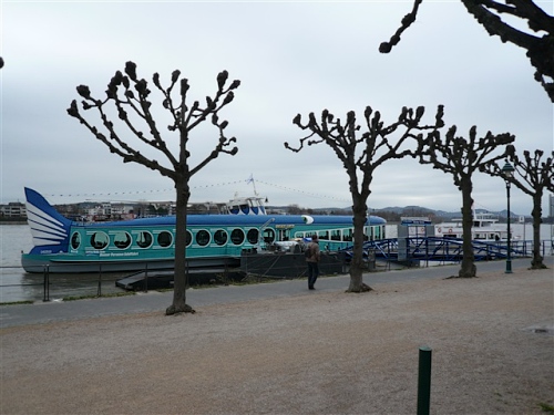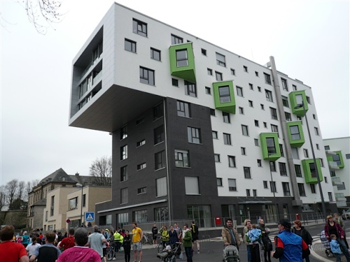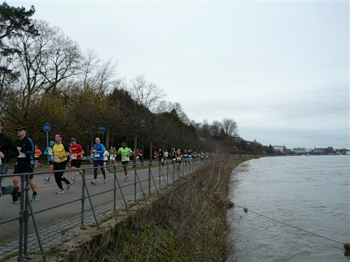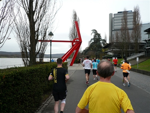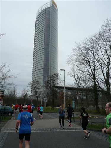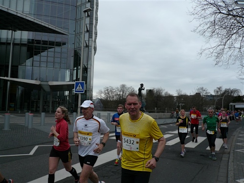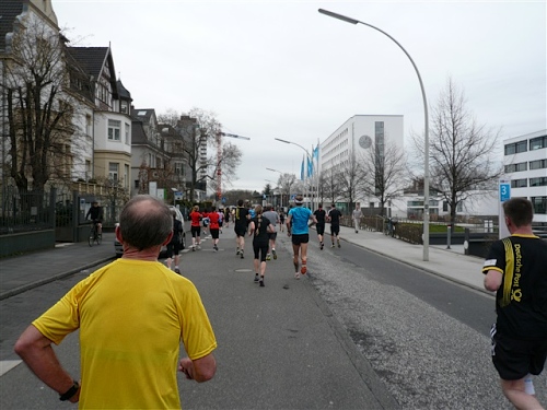 Dann winkt erneut der Rhein, den wir auf den folgenden km begleiten werden. Josef sieht entspannt aus, km 10 passieren wir nach gut 55 min., das paßt wunderbar. Eingangs der Rheinaue steht ein neuerbautes Haus, das mit seiner gewagten Architektur an die Kölner Bauten am Rhein erinnert. Vorbei geht es an der Bastion, immer mit herrlichem Blick voraus, rechts auf den „Langen Eugen“, das ehemalige Abgeordnetenhochhaus, und den Postturm, links auf das herrliche Siebengebirge. Kilometerweit kann ich die Läuferschlange zunächst nach vorne beobachten, später von vorne nach hinten, ein imposantes Bild. Ja, das ist heute der Vorteil des Halben, später, wenn nur noch die Marathonis unterwegs sein werden, wird es deutlich einsamer. Das Verhältnis der Teilnehmer ist das mittlerweile klassische 1:6, 915 Marathonläufern im Ziel stehen 6.055 Halbe gegenüber.