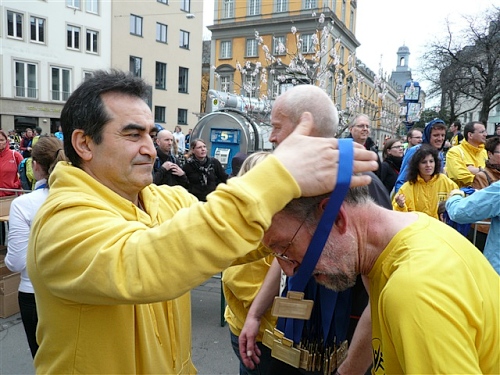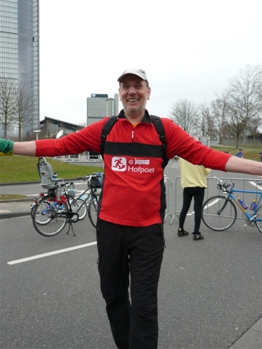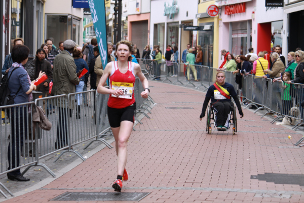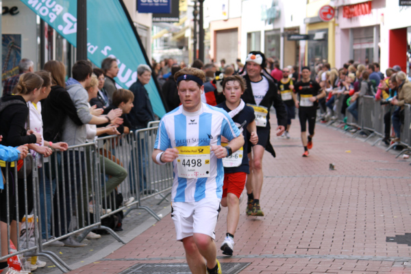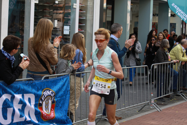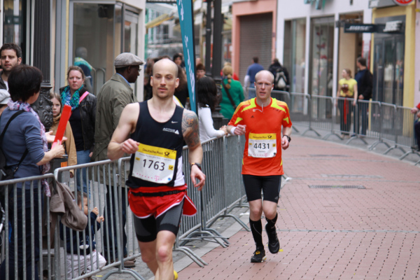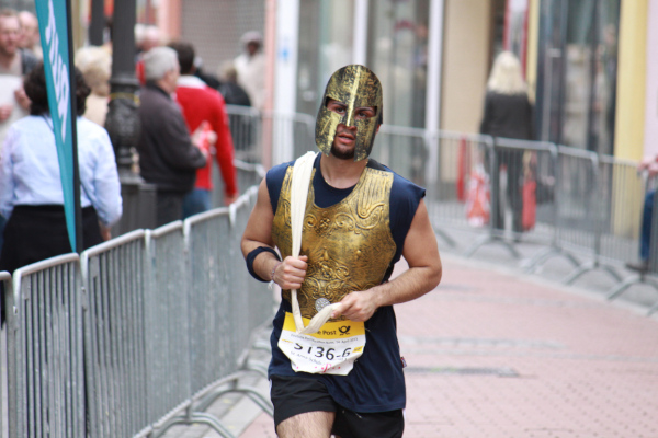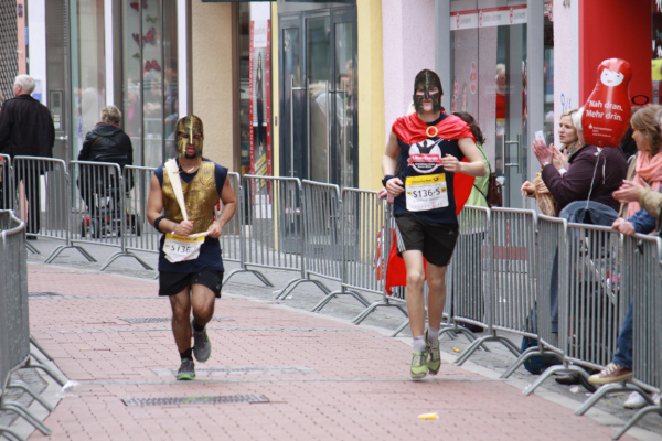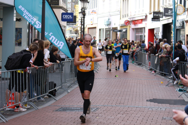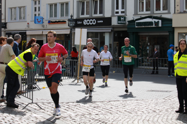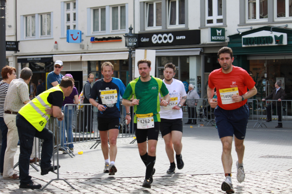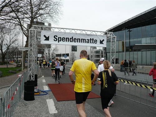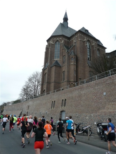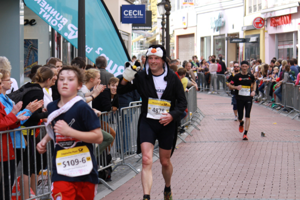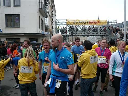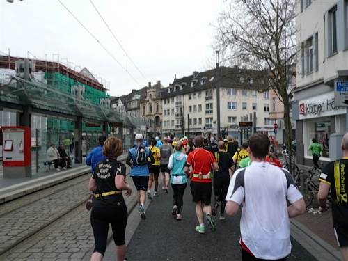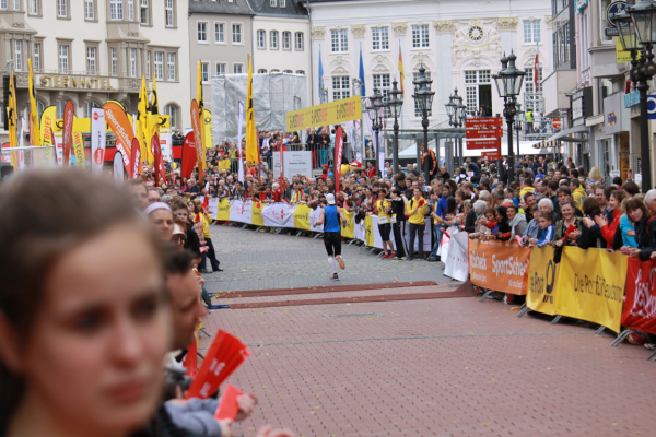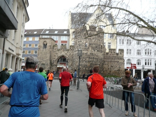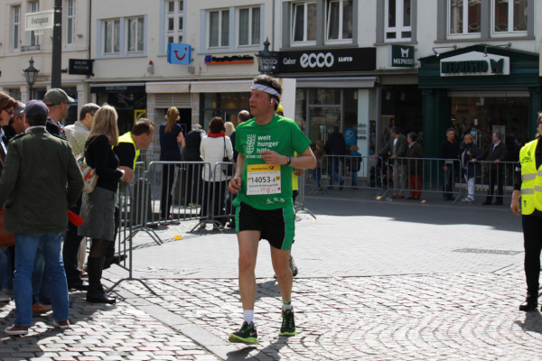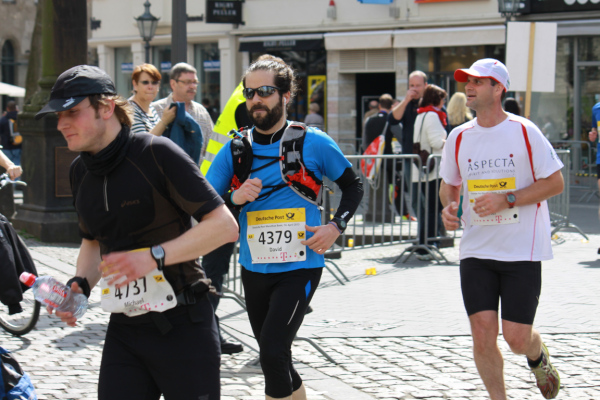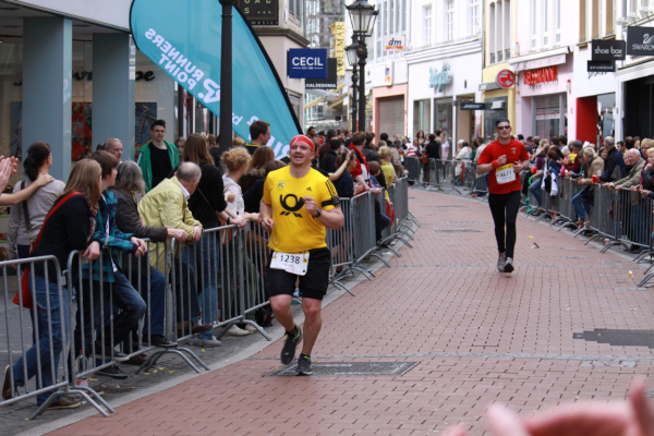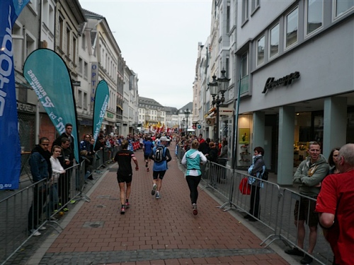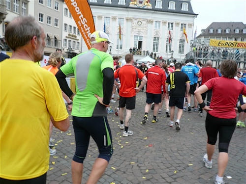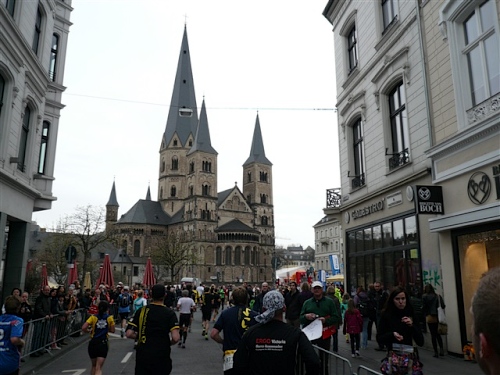 Das soll aber keinesfalls diese schöne Veranstaltung schlecht machen, aus Fehlern lernt man und macht es das nächste Mal besser. Zum Startgeld: Natürlich sind 45 € in der Hauptanmeldephase für einen Halbmarathon kein Schnäppchenpreis, aber der Gegenwert kann sich sehen lassen, nein, er ist hoch: Neben der prima Strecke und dem tollen Zielambiente gibt’s eine schöne Medaille, ein Funktionshemd, außergewöhnlich gute Zielverpflegung im „REWE-Dorf“ (Getränke, darunter Erdinger bis zum Abwinken, Obst, Quarkbällchen, Joghurt, Pudding, Brot, Fleisch- und Blutwurst – Letzteres gibt’s auch nur im Rheinland!), Pastaessen mit zwei Getränken im Festzelt auf dem Münsterplatz, Massagemöglichkeit, Finisherclip – mir fehlt hier nichts. Da kommt man gerne wieder und bringt noch Freunde mit.