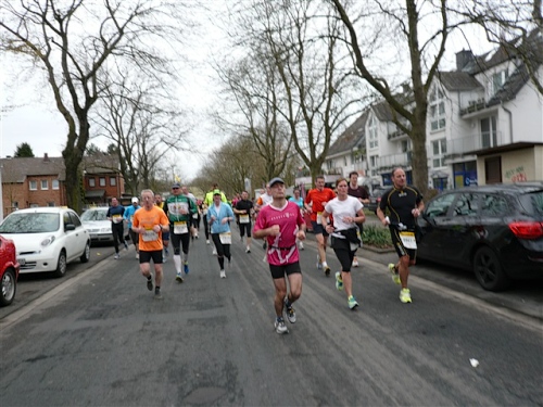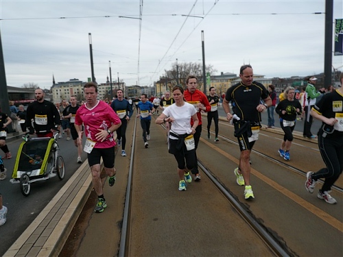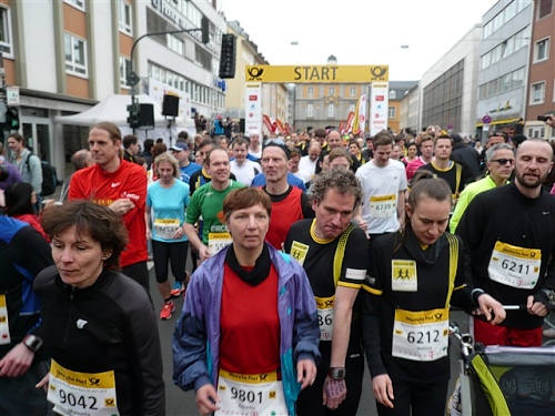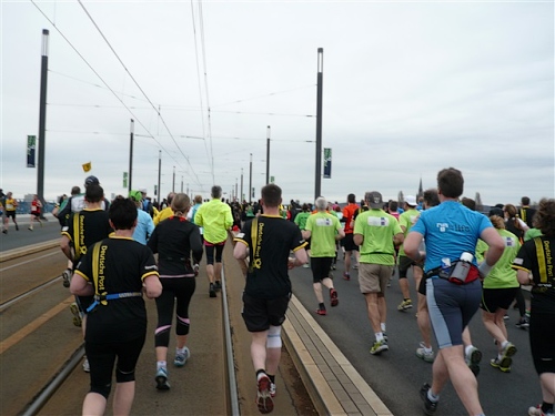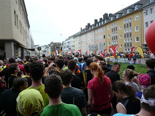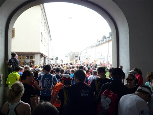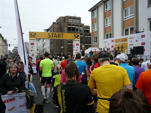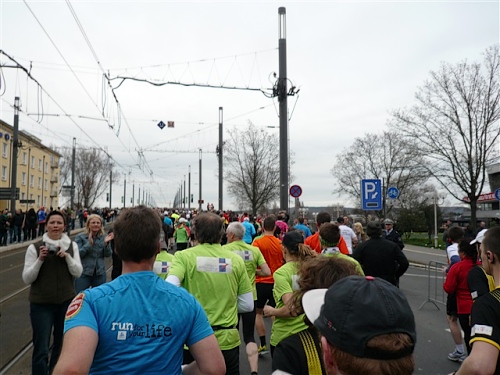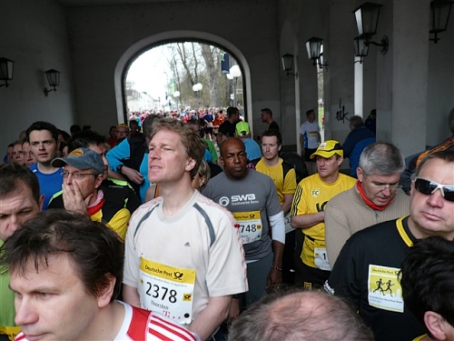 In der Startaufstellung dann ein Bild, das jeder von uns kennt: Zur letzten Erleichterung kurz vor dem Start bilden sich unvermeidliche Staus vor den Örtlichkeiten, die jeder hasst, aber keiner umgehen kann. Um 8:45 Uhr soll es losgehen, der eine oder andere bricht sein Anstehen fluchend ab, um noch schnell in den Startblock zu gelangen. Und dann erfolgen, in gefühlt homöopathischer Dosierung, Blockstarts. Ich habe dies der Ausschreibung nicht entnehmen können. Geschlagene dreißig Minuten stehe ich an, bis wir endlich loskommen. Klar, falscher Startblock, trotzdem nervt es. Gut, diejenigen, die vorher nicht zum Zuge kamen, können bestimmte Dinge jetzt noch schnell nachholen, es hat also nicht nur negative Seiten. Damit übrigens kein falscher Eindruck entsteht: Ich berichte wieder vom Halbmarathon, der allerdings die gleiche 21,1 km-Strecke nutzt und vor dem Marathon gestartet wird.