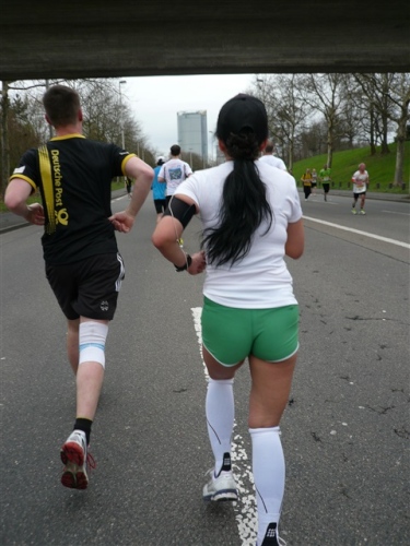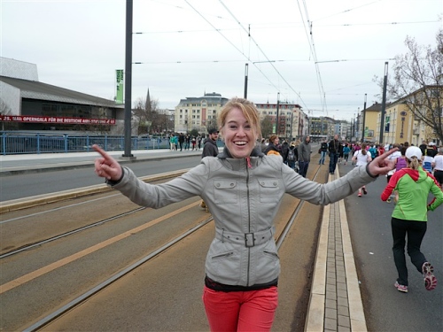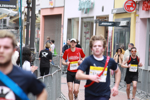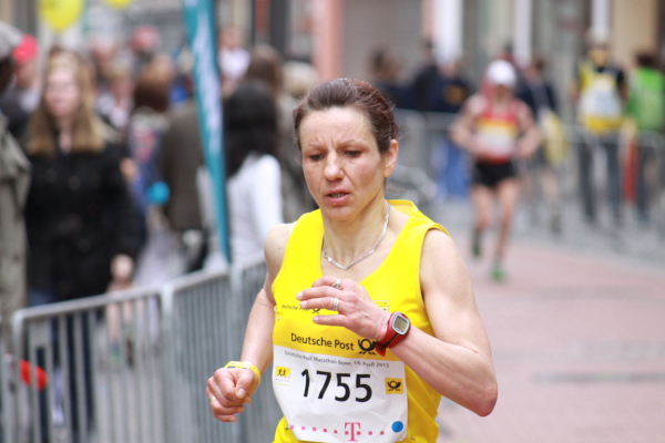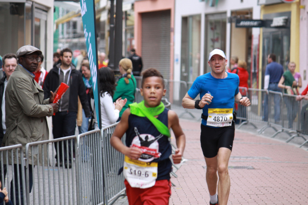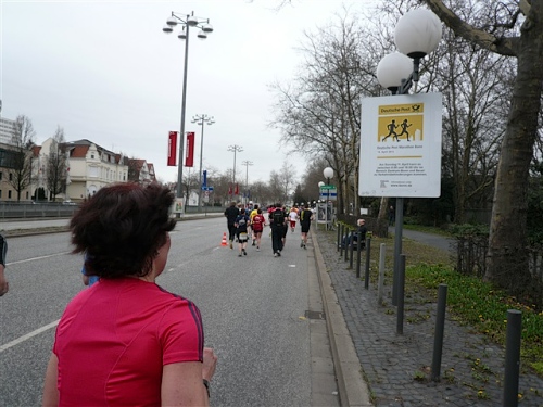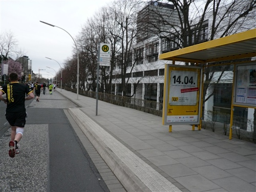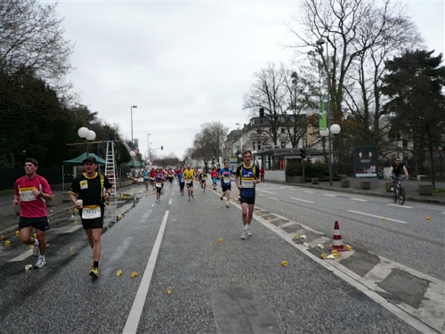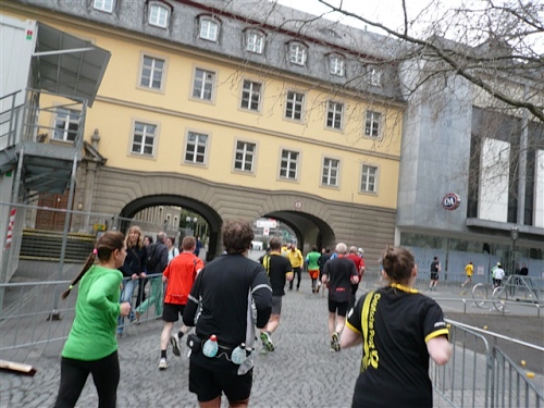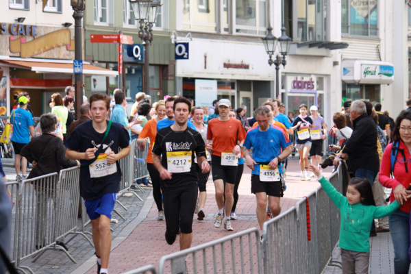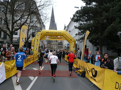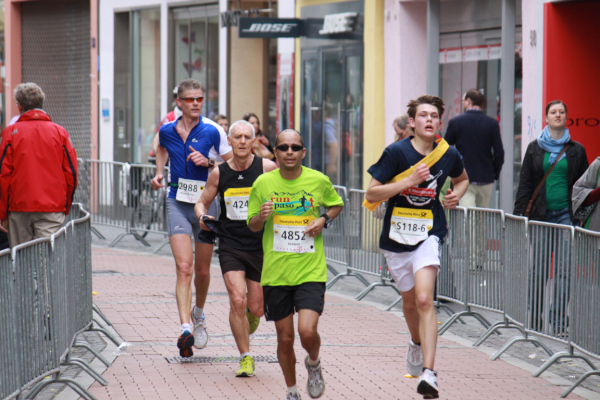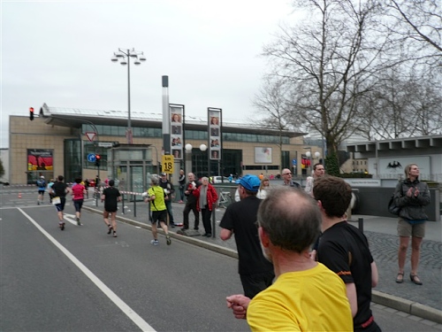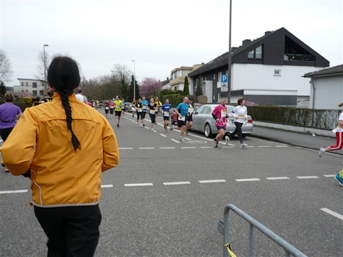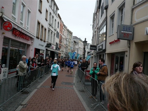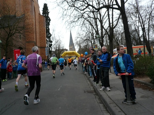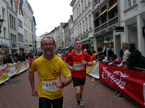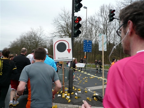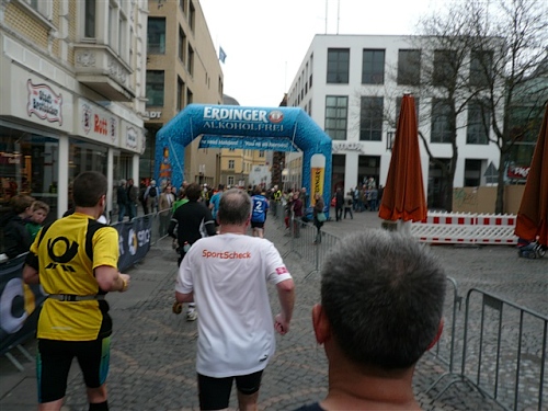 Ca. 300 bis 400 m vor dem Ziel werden Halb- und Marathonläufer getrennt. Unmittelbar an der Abzweigung hängen rechts und links zwei Schilder mit vergleichsweise dünner Beschriftung. OK, das kann man sehen, aber gerade als Ortsunkundiger bzw. Bonn-Ersttäter auch übersehen. Ich habe ja von Freiburg am letzten Sonntag den unmittelbaren Vergleich. Dort stehen mindestens zwei, ich meine sogar drei Schilder vor der Abzweigung und das Entscheidende: Ein Streckenposten, der die Meute lautstark trennt. Da kann wirklich nichts passieren und so sollte man es nach dieser Erfahrung künftig auch in Bonn machen. Zumal noch weitere Läufer falsch abgebogen sind.