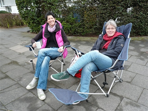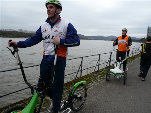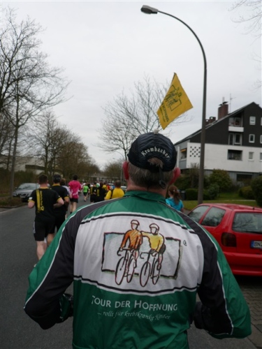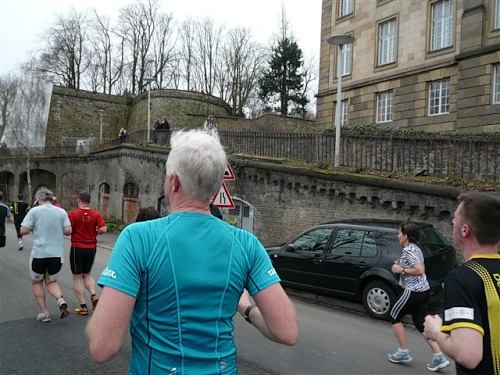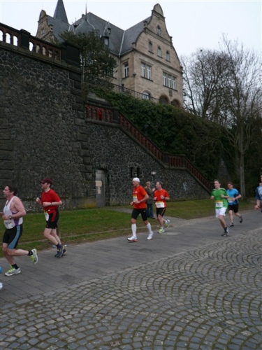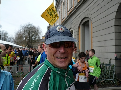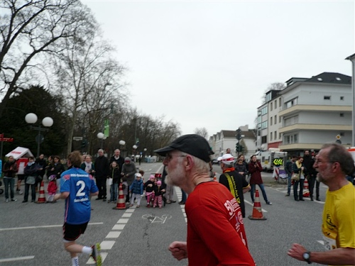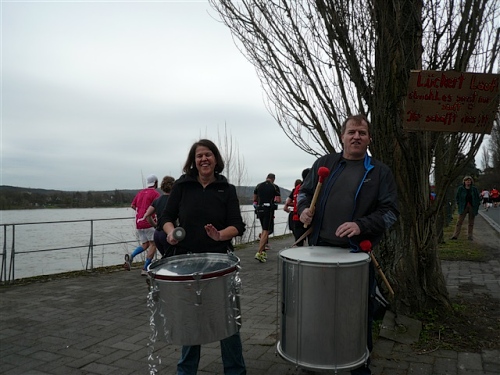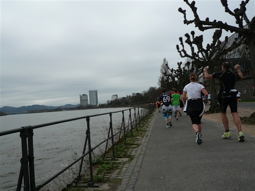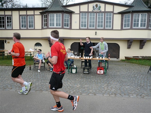 Hans-Hermann, Hannelores Mann, hat den weiten Weg mit dem Rad nicht gescheut und feuert uns mit einem Kumpel an. Hannelore selber haben wir mittlerweile verloren, sie wird das Ziel aber sicher erreichen. Die Villa Hammerschmidt, der Bonner Dienstsitz des Bundespräsidenten, wird passiert, ebenso mit dem Wasserwerk das ehemalige Ausweichquartier des Deutschen Bundestags während der Renovierung des ehemaligen Plenarsaals. Sogar die Jungs mit dem privaten Bierstand sind wieder hier. Ja, Johannes, wer in Bilstein läuft, kann den Gerstensaft in Bonn nicht mitnehmen, man muß halt Prioritäten setzen! Überraschend steht auch das Urgestein der Siebengebirger Laufszene, der selbsternannte Beutelträger, Chris Harraß, an der Strecke. Schön, daß er wieder ins Rollen gekommen ist. Tut ihm einen Gefallen und besucht zahlreich am 26. Mai den tollen Rheinsteig-Extremlauf. Wunderbare 34 km, gespickt mit 1.200 HM, weitestgehend über den Rheinsteig, erwarten Euch. Dazu gibt es übrigens einen bebilderten Laufbericht auf marathon4you.de.