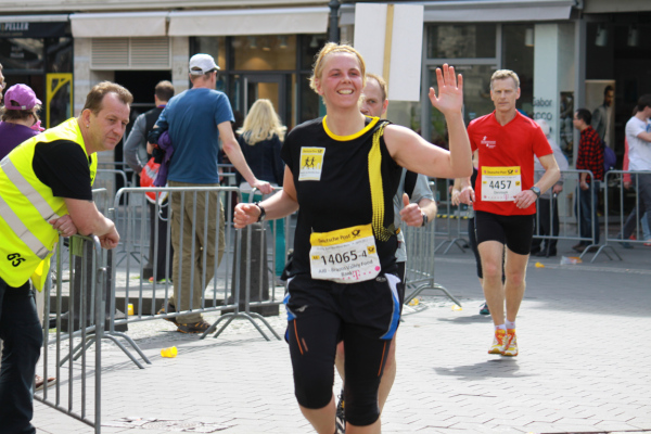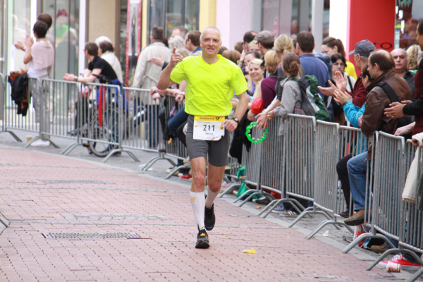 Vorbei am Münster durch die zentrale Innenstadt führen die letzten paar hundert Meter vor vielen Fans auf den Zielbogen vor dem historischen Rathaus zu. Postgelber Teppich, Brust raus – auch wenn’s nur ein Halber ist – und in Siegerpose überqueren wir den Zielstrich. Prima, noch unter 1:53, Josef ist gelöst, hat noch Reserven und schließt einen irgendwann zu startenden Marathonversuch doch nicht mehr aus. Ich bin dabei, Juppi!