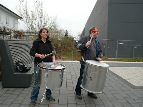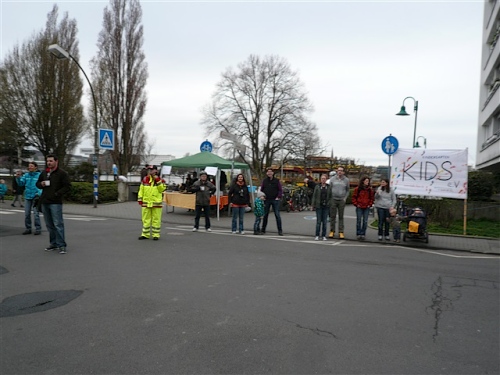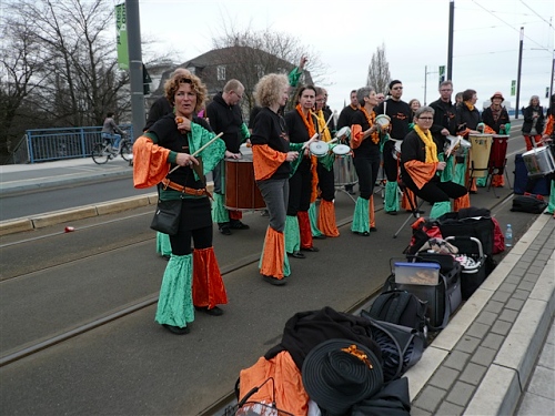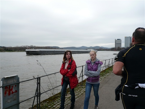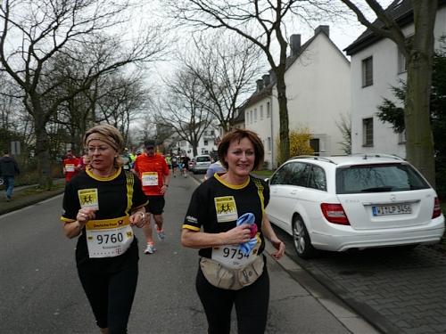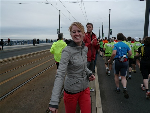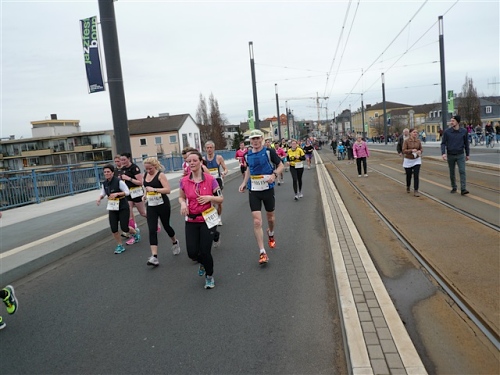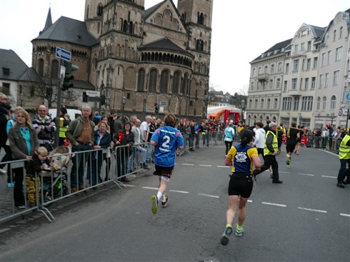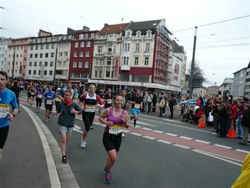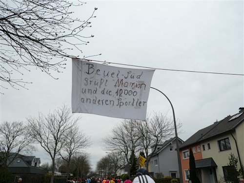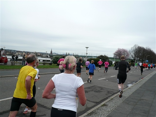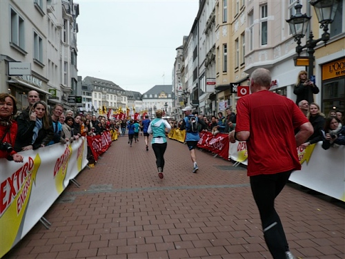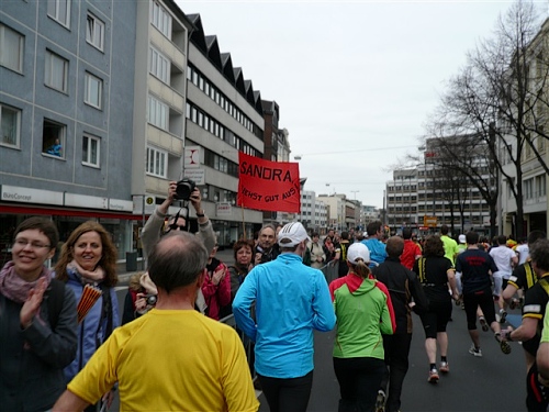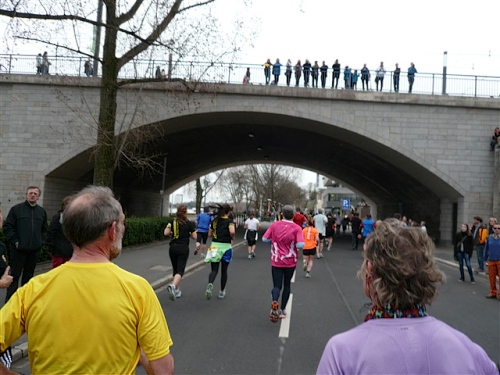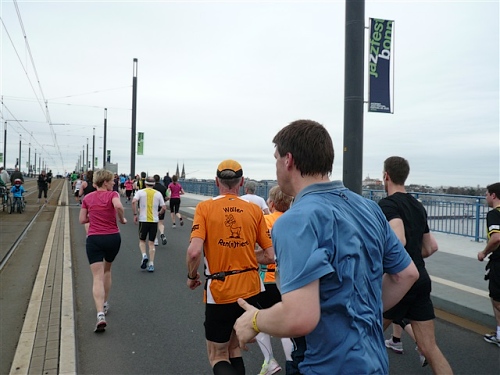 Nach dem siebten oder achten Countdown, den Überblick habe ich längst verloren, dürfen auch wir endlich den Startbogen unterqueren. Zunächst ein paar Meter geradeaus, geht es dann nach rechts direkt über die den Rhein überspannende Kennedybrücke auf die Beueler Seite. Auf dem Mittelstreifen steht neben vielen anderen – nein, heute nicht Elke. Meinen mobilen Fanblock bildet heute unsere Tochter Vicky, die noch zwei Kolleginnen unterstützt, die hier erfolgreich ihren ersten Halbmarathon absolvieren werden. Genau so wie der hoffnungsfrohe Nachwuchs meiner Lauffreundinnen Hannelore und Andrea. Fein ist bereits die Percussions-Band, die uns lautstark Beine macht und gut gelaunt alles bearbeitet, was Krach macht. Die Straßen in Beuel sind breit, dazu ist das Feld natürlich stark entzerrt, wir finden sogleich unseren Rhythmus. Knapp unter zwei Stunden, das ist Josefs gewünschte Pace, um heute sicher durchzukommen, und das paßt auch für Hannelore und ihren Filius Manuel, also bilden wir ein Wiedtal-Quartett.