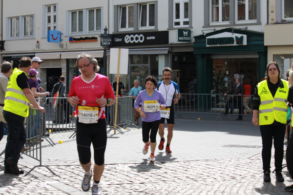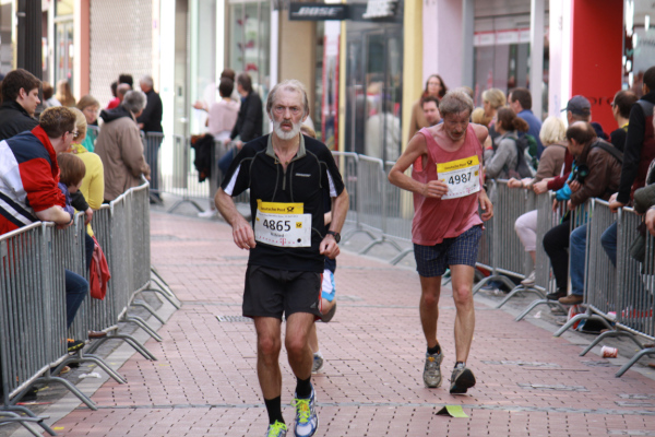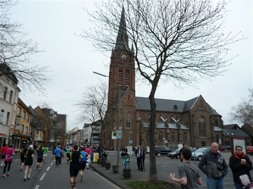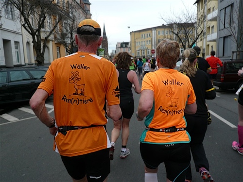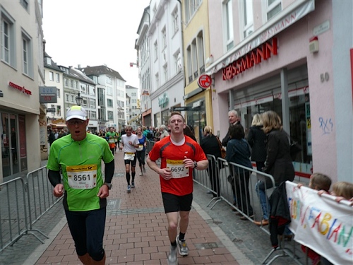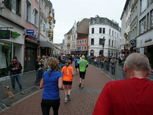 Vorbei am Postturm sind als erneute Wendepunktstrecke breite Straßen abzulaufen, auf denen man sich auch bei hoher Läuferdichte nicht in die Quere kommt. Schon die ganze Zeit halte ich Ausschau nach ihnen, weil sie mir auf der ersten Begegnungsstrecke zum Ablichten zu überraschend kamen: Nämlich Schneewittchen und die sieben Zwerge. Dann sehe ich sie, bevor ich abbiegen muß, tatsächlich noch und laufe extra auf die andere Seite, um sie vor die Linse zu bekommen. Die haben auch die professionellen Medienvertreter beeindruckt, in der Rhein-Zeitung sind sie heute groß abgebildet. Bei Josef paßt alles noch, sogar besser, als erwartet. 6 km vor dem Ziel löst er nach Ankündigung die Handbremse zum Härtetest und ab sofort laufen wir pro km eine ganze Minute schneller. So durch das Feld zu pflügen, macht schon Spaß! Sogar Manuel hält bei seinem Debut wacker mit, meint sogar, daß es für sein Knie besser sei, schnell als langsam zu laufen. Erst bei km 18 muß er abreißen lassen, wird aber knappe zwei Minuten nach uns, stolz wie Bolle, im Ziel sein.