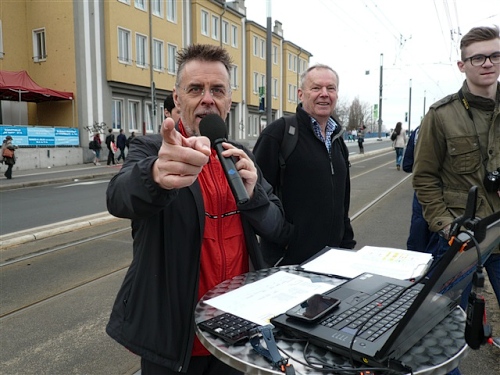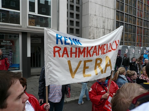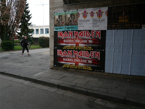 Aufgrund des Mehrfach-Starts – eine Zugangskontrolle zu den Startblöcken fand nicht statt – hat man beim Gegenverkehr keinen Dunst, welche Preisklasse einem da entgegenkommt, denn es läuft wohl außer der Spitze alles kunterbunt durcheinander. Macht aber nichts, dafür hat man ja ein Zeiteisen am Handgelenk. Das Laufen durch ruhige Wohngegenden, immer wieder mit einigen Stimmungsnestern durchsetzt, ist nett, die Verpflegung gut (das Angebot für Halbmarathon eigentlich überdimensioniert). Nach sieben km unterqueren wir die Kennedybrücke, bevor es wieder hinüber auf die Bonner Seite geht. Die Iron Maiden-Plakate sind Balsam für die Seele, leider nicht für meine Ohren. Heavy Metal for President! Ihr erinnert Euch an meinen Freiburger Bericht. Den Dudelsackspieler habe sicher nicht nur ich trotzdem vermisst. Am Brückenaufgang steht unser Freund Jochen Heringhaus am Mikro und beauftragt mich, die Marathongemeinde herzlich zu grüßen. Was ich hiermit gerne getan habe.