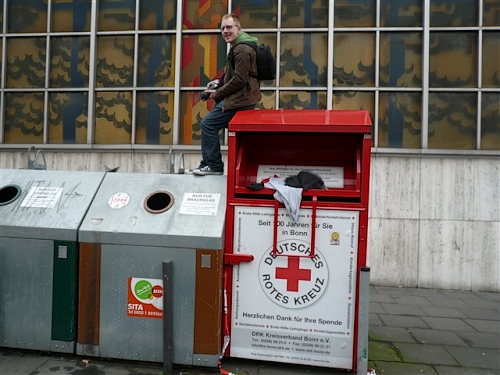 Bei dem jetzt flotten Laufen wird das Fotografieren schwieriger, seht mir bitte die gelegentlichen Unschärfen nach. Die meisten Teilnehmer überlaufen eine Spendenmatte und tun damit dem Bonner Sport etwas Gutes. Vorbei an der Zentrale der deutschen Welle und dem Haus der Ge(s)chichte nähern wir uns wieder der Innenstadt. Das Adenauer-Denkmal, das ich sonst immer stehend aus der Nähe knipse, muß ich im Vorbeihetzen fotografieren, sonst entwischt mir der Josef. Klappt trotzdem. Villa Hammerschmidt von vorne, Verpflegungspunkt der Bundeswehr, Dusche zur Abkühlung, Museum König, der erste Plenarsaal der jungen Bonner Republik, vieles gibt es zu sehen. Der letzte km, starker Zuschauerzuspruch, so möchte man das haben. Und nimmt die Beine in die Hand. Ja, beim Schaulaufen hängst Du Dich selbst als alter Zausel mit jeder Menge Erfahrung noch rein!