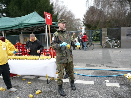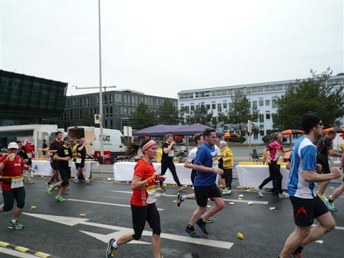 6 Verpflegungsstände und zusätzliche 2 Wasserstellen an der Strecke auf jeder Halbmarathonrunde. Es gibt Wasser, Tee, Cola, Isogetränk und Bananen als feste Nahrung. Im REWE-Verpflegungsdorf für die Finisher grandiose Zielverpflegung.