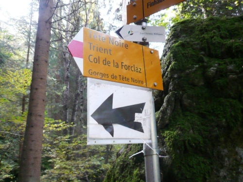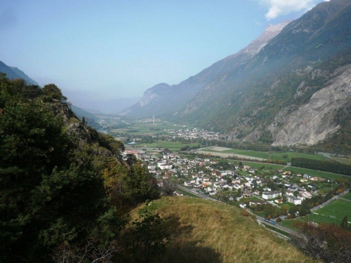 Auf diesem Abschnitt begegnen wir auch immer wieder Wanderern mit Startnummern, teilweise ganze Familien, welche einen Teilabschnitt des Défi zurücklegen. Ein steiniger Pfad führt nach 50 Kilometern die steile Talflanke zum Rhonetal hinunter. Nun sind wir wieder in Vernayaz, diesmal kommen wir aber durch das Dorf hindurch. Zuerst geht es am Eingang der Trientschlucht vorbei. Am Grund dieses Einschnitts von mehreren hundert Metern fließt der Gletscherfluss Trient der Rhone entgegen. In 200 m Höhe wird er von zwei der höchsten Brücken Europas überspannt. Wenn ich mir dieses Schauspiel (gegen Eintritt) ansehen will, muss ich im kommenden Jahr wiederkommen. Der Zugang ist nur von Mai bis September geöffnet.