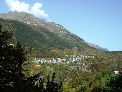Es geht weiter hoch, zuerst auf gut zu belaufender Straße und Wirtschaftswegen, dann nach einer kurzen Gefällstrecke auf Trailpfaden hoch. Zuvor bietet sich mir ein unvergleichlich schöner Blick den Taleinschnitt hoch. Im Vordergrund Wasser, an den Abhängen bunt gefärbte Bäume und dahinter erhebt sich stolz die Cime de l’est. „Das wird es“, denke ich und werfe meine Kamera an. Der Versuch, auf der veralgten Holzbrücke zu stoppen, geht nicht in, sondern auf die Hose. Wie auf einem Stück blanken Eises haut es mich um. Da nichts schmerzt und ich mich nur erschrocken habe, stehe ich gleich auf und versuche, das anvisierte Motiv in den Sucher zu nehmen. Darin erkenne ich nur Unschärfe, was mich stutzig macht. Ein Blick auf die andere Seite der Kamera zeigt mir dann weshalb. Das Objektiv ist periskopisch verbogen und lässt keine Schärfeeinstellung mehr zu. Auf den folgenden mehr als drei Trailkilometern bis Mex versuche ich mit verschwitzten Händen, allen erdenklichen Kniffen und grobmechanischen Eingriffen mit Feingefühl mein optisches Gedächtnis wieder zum Mittun zu bringen. In dem kleinen Dorf gibt es wieder einen Kontroll- und, siehe da, Verpflegungsposten.
