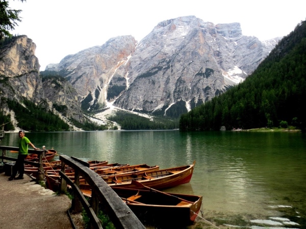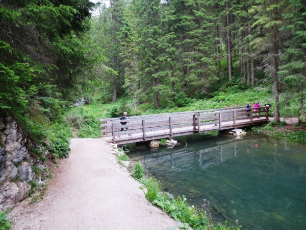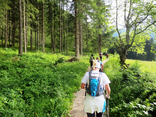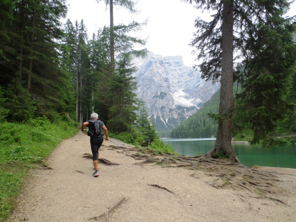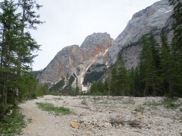 Pünktlich um 18:00 h werden wir ziemlich unspektakulär auf die Strecke geschickt. Wir verlassen die kleine Ortschaft auf einer Teerstraße, die zum Pragser Wildsee führt. Nach weniger als einem km biegen wir links ab, um auf Schotter- und Waldwegen leicht ansteigend genau dorthin zu gelangen.