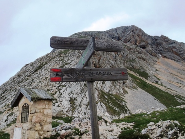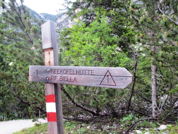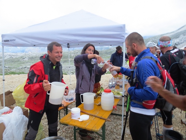 Ein traumhaftes Panorama bietet sich. Wir laufen am Ufer entlang, umrunden den See zu knapp einem Drittel und biegen dann nach links ab. Der erste richtige Aufstieg beginnt. Bis zum Rifugio Biella (Seekofelhütte) sind knappe 850 Höhenmeter zu überwinden. Gegen 20:20 h bin ich dort. Die Verpflegungsstelle auf 2.327 m Seehöhe bietet Tee, Iso, verflüssigte Gummibärchen, Wasser, Bananen und sehr süßes italienisches Gebäck. Das aus meiner Sicht eher dürftige Angebot wird durch die Begeisterung und Freundlichkeit der Helfer mehr als kompensiert.