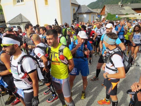 Das Briefing findet, mangels einer signifikanten Anzahl von Teilnehmern aus dem Ausland, nur auf Italienisch statt. Wichtig sind für mich die Erklärungen zur Markierung des Kurses. Neben den Markierungen des Wanderwegs seien die Abzweigungen dreifach ausgeschildert. Ein reflektierender Pfeil kündigt eine Abzweigung an, an der Abzweigung selbst befindet sich ein Richtungspfeil und nach der Abzweigung folgt eine weitere Markierung als Bestätigung. Für mich ist das absolut logisch und ausreichend. Es wird ausdrücklich darauf hingewiesen, dass bei einem schlüssigen Wegverlauf auch über längere Distanzen keine zusätzlichen Markierungen angebracht sein werden.