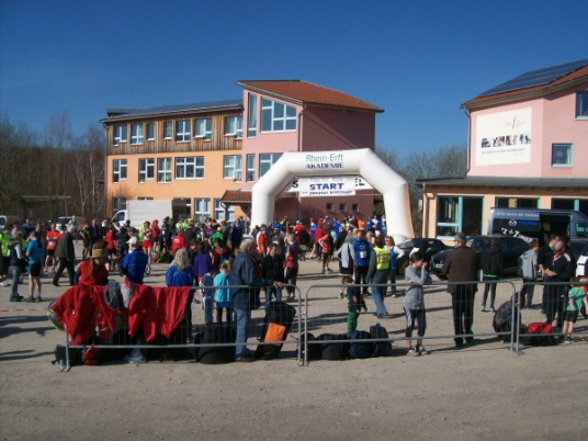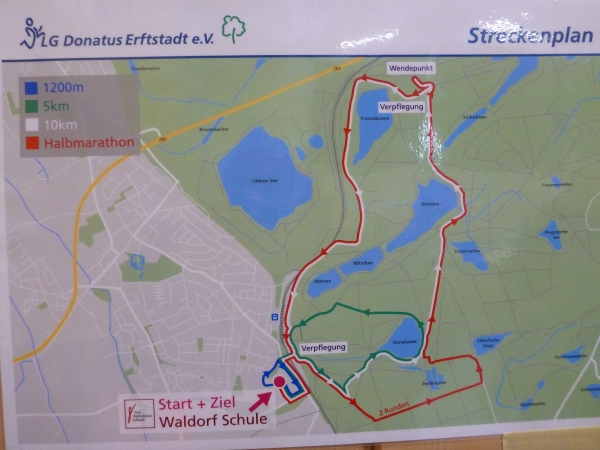„Ich bin wieder hier, in meinem Revier“ singt Marius Müller-Westernhagen. Das denke ich mir, als ich in Erftstadt am P+R Parkplatz am Bahnhof parke. 500M Fußweg und wir sind an der Freien Waldorfschule Erftstadt. Hier gibt es die Startunterlagen, Kaffee und Kuchen und Duschgelegenheiten. Und hier ist Start und Ziel.