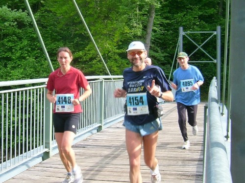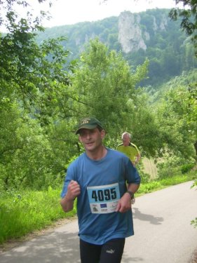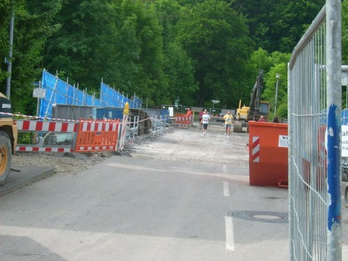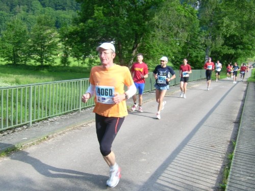 Wir überqueren die Donau bei Kilometer 9 in der Nähe des Donauhauses. Mehrere Läufer hantieren, so wie ich, mit einer Kamera. Dieter Ehrenberger vom LT Hemsbach lichtet mich ab. Wir wechseln ein paar Worte, anschließend lässt er sich zurückfallen. Einen Kilometer später finden wir die nächste Tankstelle bei der St. Maurus-Kapelle. Das Tal ist sehr eng, die Eisenbahn erscheint wieder aus einem Tunnel.