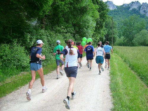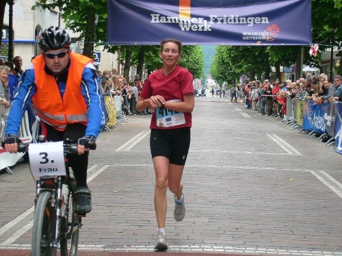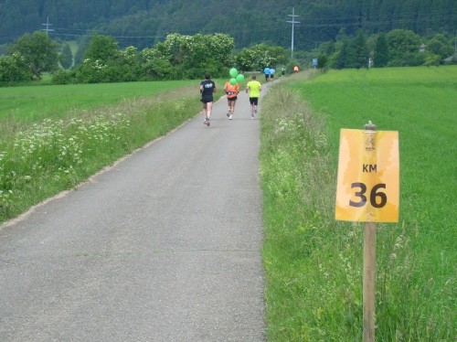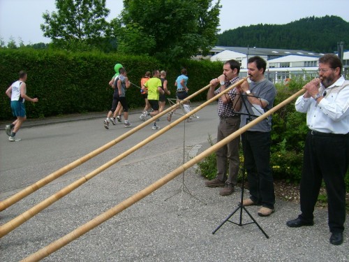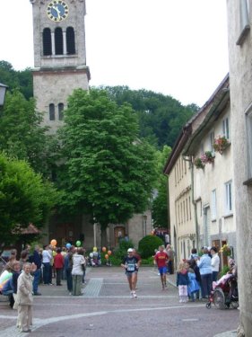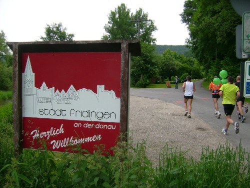 In Fridingen (Kilometer 24) ist der Teufel los. Am Ortsrand hockt eine Frau am Straßenrand und haut mit einem Kochlöffel auf einen Deckel. Der Lärm steigert sich dann im denkmalgeschützten Stadtzentrum. Besonders vor dem Rathaus, da hat man Biertische aufgestellt und Fahnen hochgezogen, und an der St. Martinskirche herrscht Stimmung wie bei einem Citymarathon. Jeder Marathoni bekommt seinen Applaus und Ansprache. Am Stadtrand finden wir dann drei Alphornbläser. Nach einem weiteren Wegstück überholt unsere Gruppe, wir sind immer noch 10 Läufer, die Dritte des Frauenfeldes.